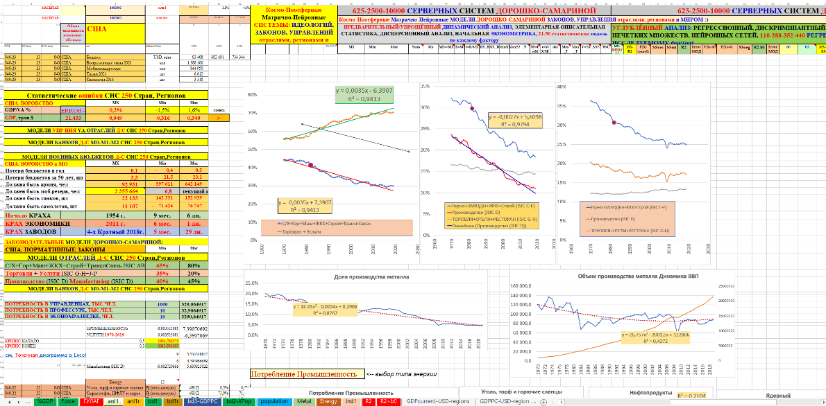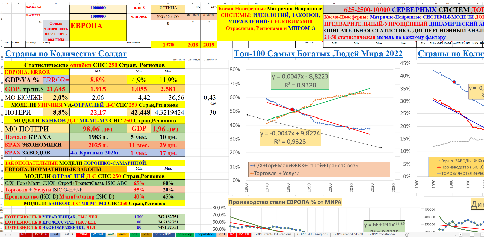 В монографии использованы материалы 30–40-летней давности по космо-ноосферным системам, нейронным геополитическим, геоэкономическим моделям промышленности, тяжёлой промышленности, стали, цемента мировых лидеров СССР-СЭВ, США, стран Западной Европы, «азиатских тигров», Японии, Китая и в целом всех государств-членов ООН. Профессионалам известно, что без стали, цемента и в целом тяжёлой промышленности невозможно космо-ноосферное, социально-экономическое эффективное развитие государства даже с любым безумным политическим строем, любыми политическими партиями. После сионо-фашистского Беловежского приворота это бездарное управление устойчиво наблюдается в США, ЕС в государствах СЭВ и республиках СССР. В космо-ноосферных системах с помощью авторских космо-ноосферных, геополитических, геоэкономических нейронных моделей мирового производства стали, цемента в натуральном, а не виртуальном выражении наглядно и убедительно доказано скрытое уничтожение США, начиная с 1954 года (модели геополитического, геоэкономического креста катастрофы США) и после 1970–1980–1990гг. целенаправленно-откровенная ликвидация США, ЕС, СССР-СЭВ.