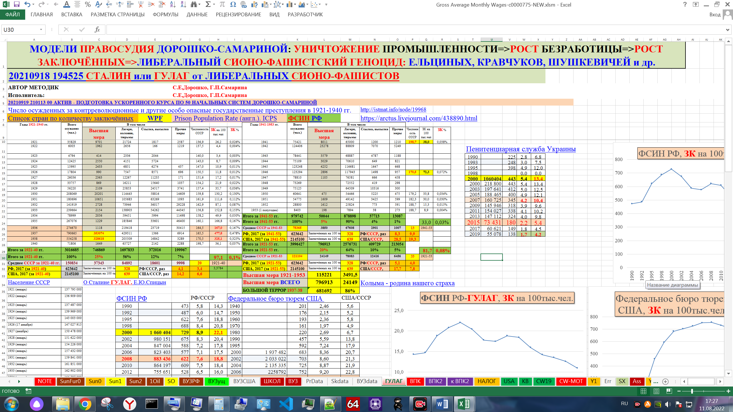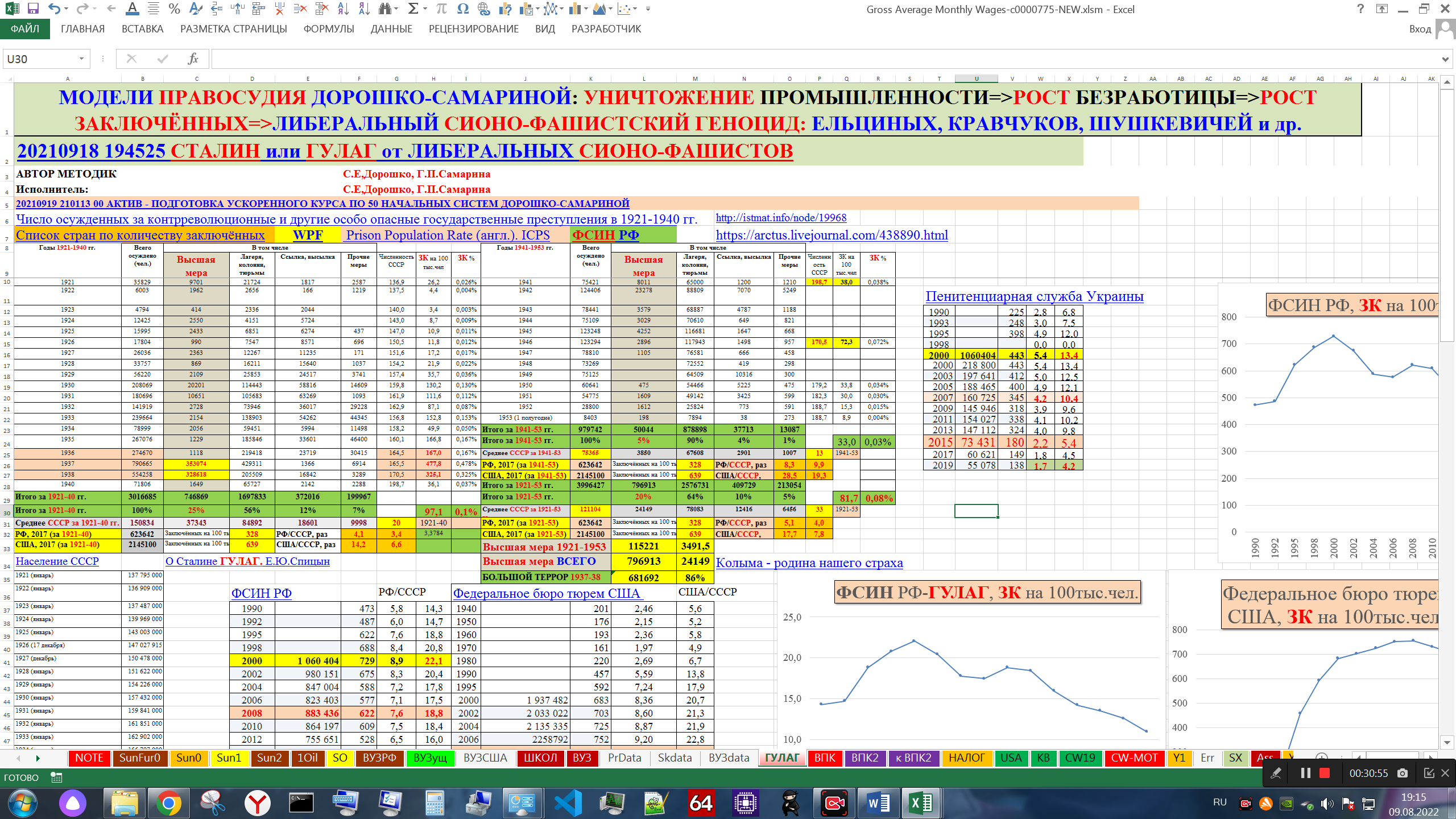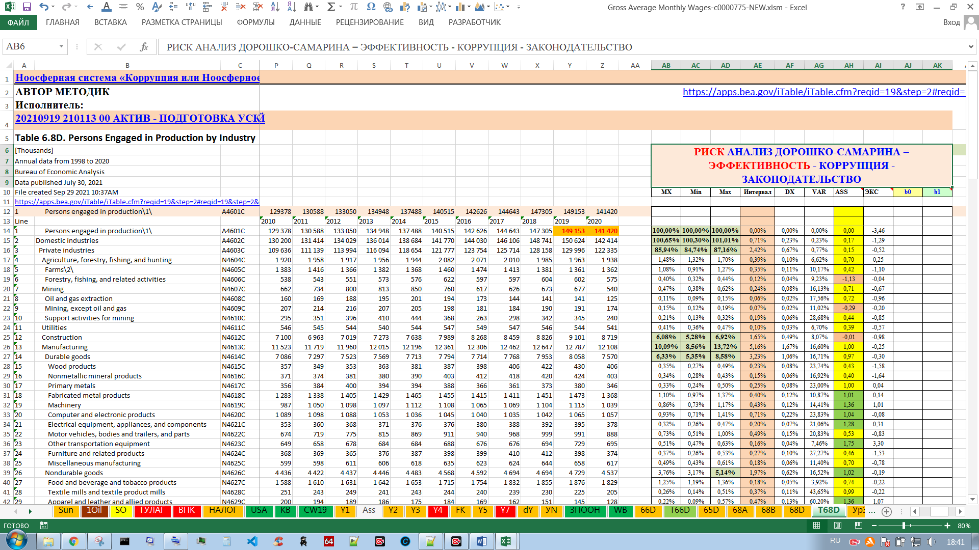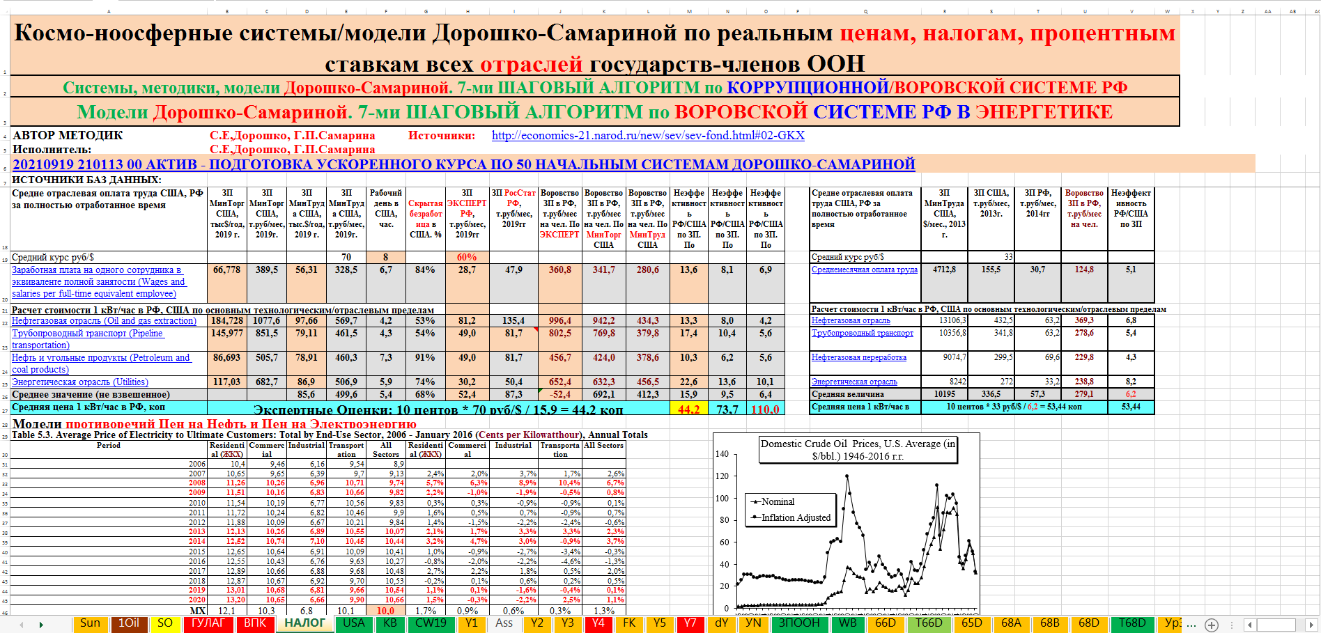 В рамках космо-ноосферных систем Дорошко-Самариной, чтобы понять масштаб скрытых военных преступлений руководства США необходимо данный расчёт расширить через отраслевую призму. Для этого рассчитаем масштаб скрытой безработицы в нефтегазовой отрасли экономики США. Для этого также будем использовать данные как Министерства труда, так и данные Министерства торговли США. Согласно базам данных Министерства труда среднегодовая заработная плата в нефте-газовой отрасли (код NAICS 211100) - 106 790 долларов США, а по данным Министерства торговли среднегодовая заработная плата за полностью отработанное время составляет 201 341 доллар США. Несложные арифметические действия на уровне начальной школы позволяют определить, что реальная безработица в США по нефтегазовой отрасли составляет около 50%, т.е. нефтяники и газовщики в США недополучают каждый год 94551 доллар США в год на человека. Т.е. на самом деле, если разделить 106 790 долларов США на 201 341 долларов США, то мы получим процент или ответим на вопрос сколько часов в день работал нефтяник в 2022 году. Эта величина составляет порядка 0,53 или 53% от 8-часового рабочего дня при полной занятости. Рассчитаем сколько часов в день работал нефтяник, газовщик в 2022 году в США. Для этого умножим 53% на 8 часов и получим: 4,24 часа или 4 часа 15 минут.