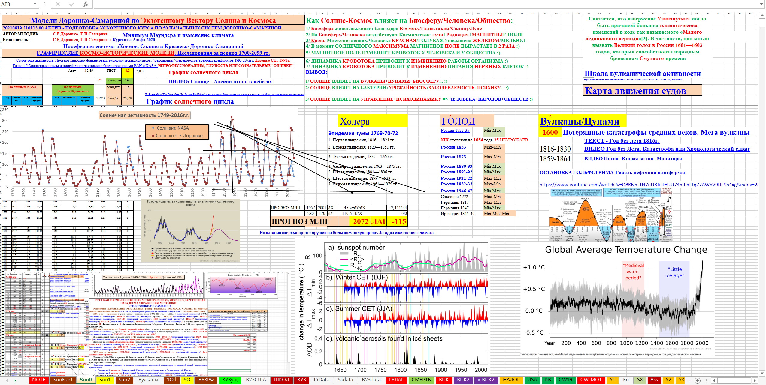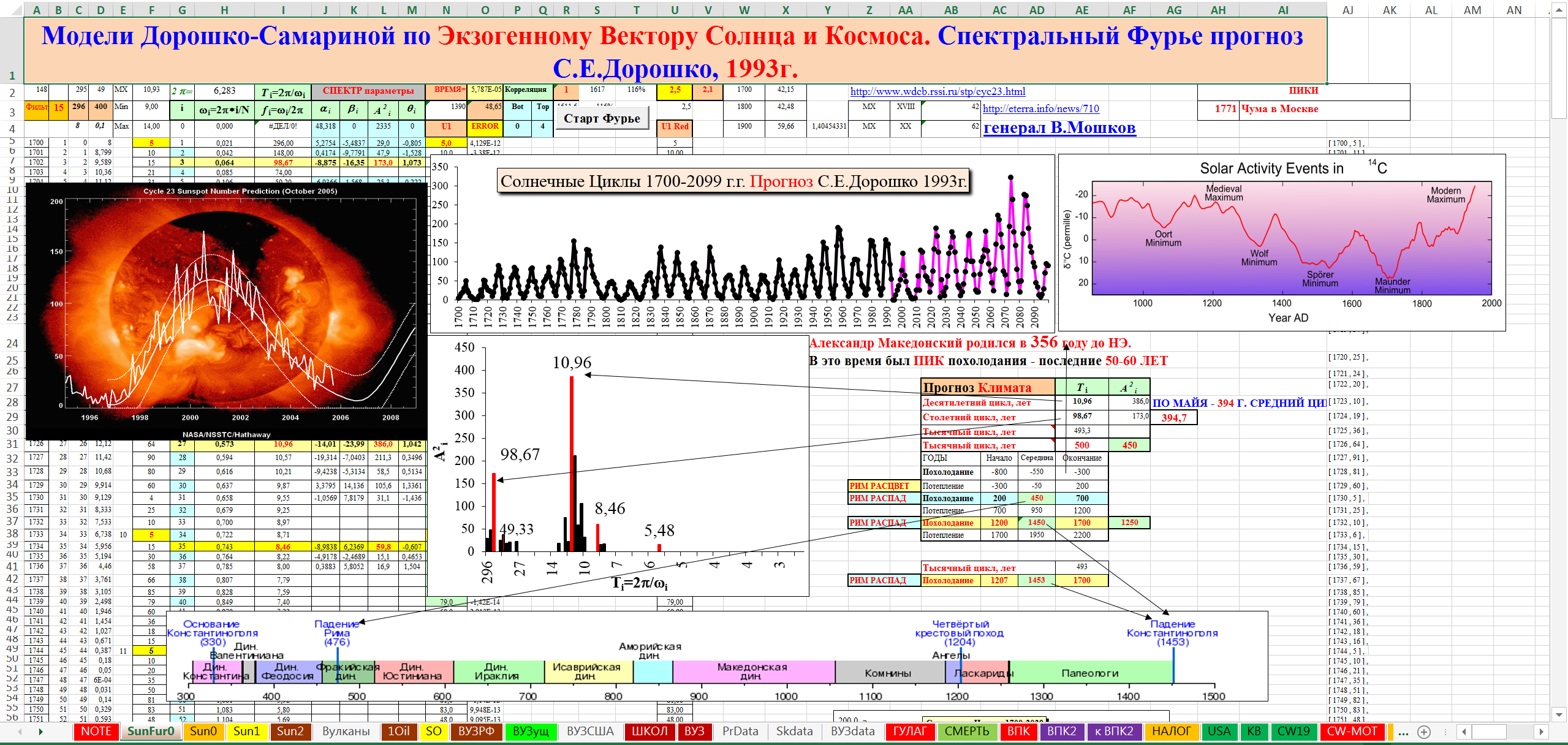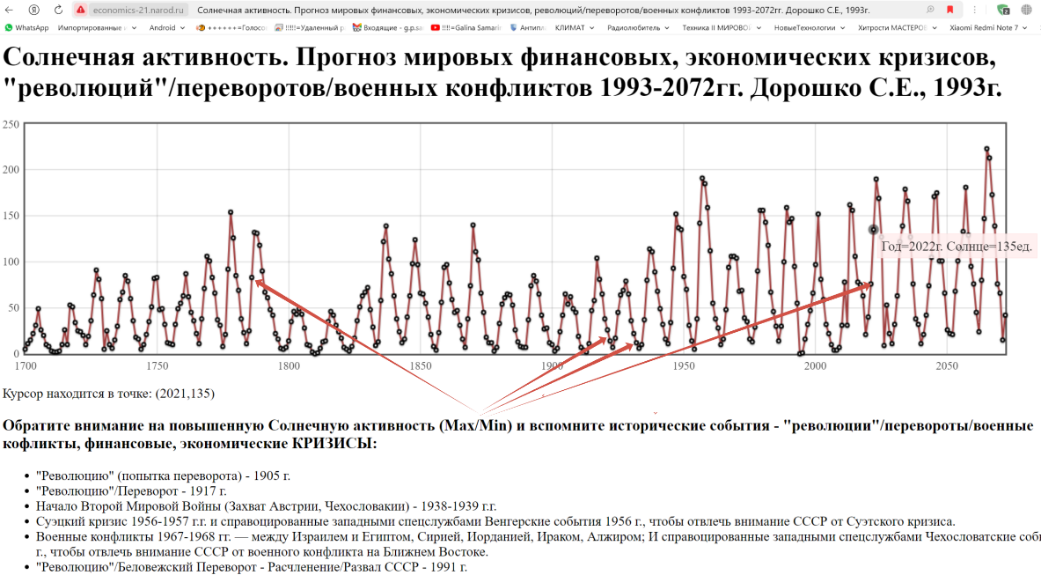 Обратите внимание на прогнозы С.Е.Дорошко, Г.П.Самариной по неурожаям на западе, связанные с засухами в период фазы подъёма солнечной активности в 2021-2022г. ближе к максимуму 2023г.: «…Летом 2022 года страны Европы столкнулись с рекордной жарой и угрозой серьёзной засухи. В середине июля Еврокомиссия оценивала, что проблема может коснуться половины территории Евросоюза. В части регионов также значительна угроза лесных пожаров. Снижение уровня воды в реках, в частности в Рейне, негативно сказывается на ситуации в энергетике, проблемы возникают с доставкой грузов. Франция в августе сформировала для борьбы с самой серьёзной в истории засухой особый антикризисный штаб…» (https://lenta.ru/tags/story/zasuha/). И далее: «…Самым жарким в Европе оказалось лето 2022 года. Тогда из-за аномально высокой температуры были перегружены системы энергоснабжения и снизилось сельскохозяйственное производство…» (https://lenta.ru/news/2023/06/30/zhara_zhdet/). Поэтому в рамках космо-ноосферных систем Дорошко-Самариной на базе одного из космо-ноосферных комплексов С.Е.Дорошко, Г.П.Самарина «Ноосферная система «Космос, Солнце и Кризисы» Дорошко-Самариной» (http://economics-21.narod.ru/Book/book-17/b17.html#ds01) несложно было дать прогноз на 2023 г. и как активно политики, блогеры и диванные эксперты будут обсуждать «Зерновые сделки» по Украине. В рамках космо-ноосферных систем, моделей Дорошко-Самариной зерно в 2023 г. нужно было западу (ЕС, США) в связи с засухой и неурожаем в 2021-2022 гг., а запад по сценариям Голливуда по традиции прикрылся как всегда третьим миром, в т. ч. Африкой.