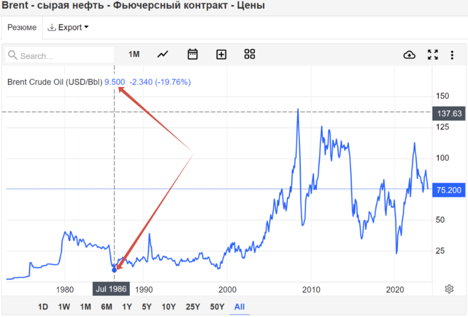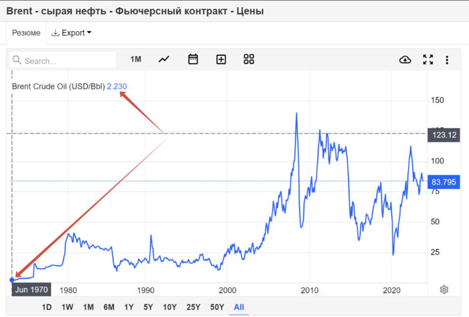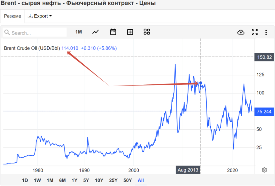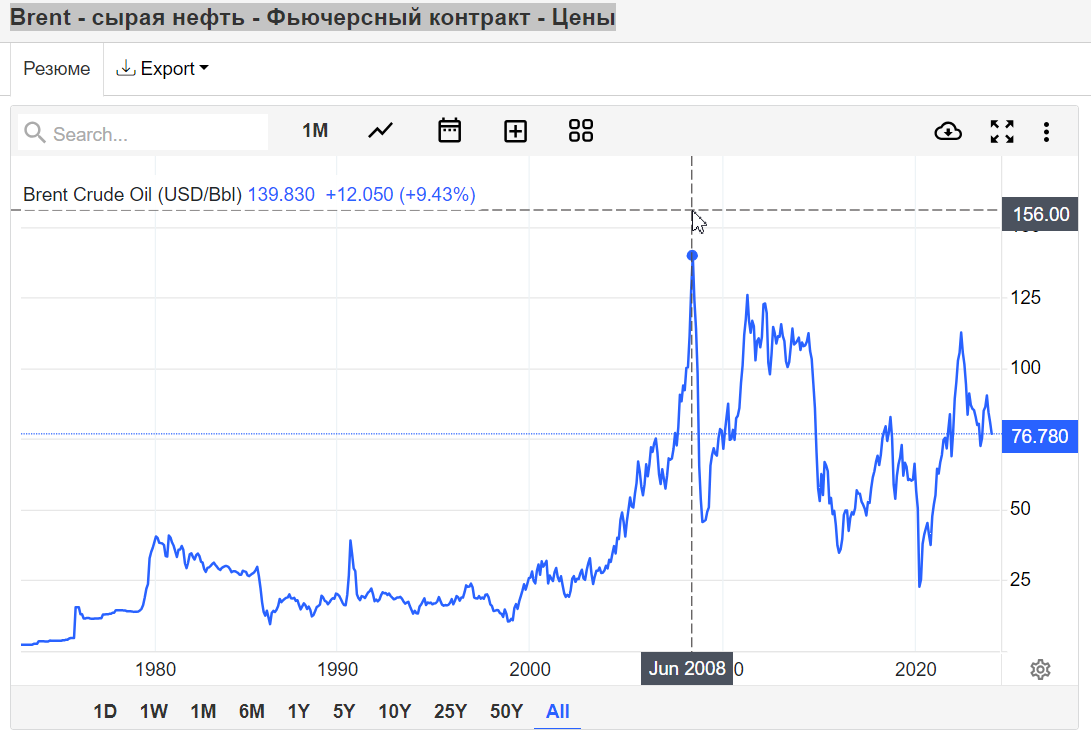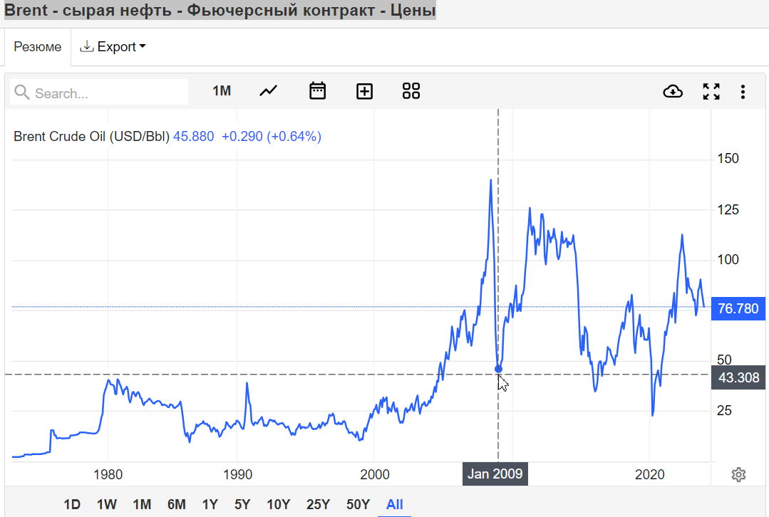 Например, любому курсанту Академии несложно это доказать, анализируя мировой энергетический рынок нефти. Для этого необходимо зайти в интернет-базу данных показателя «Brent - сырая нефть - Фьючерсный контракт – Цены» (https://ru.tradingeconomics.com/commodity/brent-crude-oil ) и найти 2008 год, как это показано на графике.