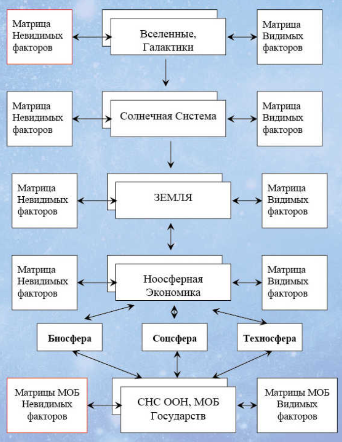 Авторские концепции разрабатываются как ноосферные комплексы по управлению всей микро-мезо-макроэкономикой, всех предприятий, отраслей, рынков, регионов, всех стран, а также на уровне межгосударственного управления, в т. ч. как мобилизационные системы выживания в условиях климатических потрясений. Концепции авторов охватывают все иерархические уровни управления от рабочего места, участков/подразделений/цехов, предприятий, отраслей, рынков, регионов, стран, включая межгосударственный уровень — http://economics-21.narod.ru/new/sev/ig_html_m1864ec7c.png. Такое масштабное управление микро-мезо-макро, включая геоэкономику, геополитику, в т. ч. всех силовиков, министерств иностранных дел и др., авторы назвали «системой управления из любой точки мира».