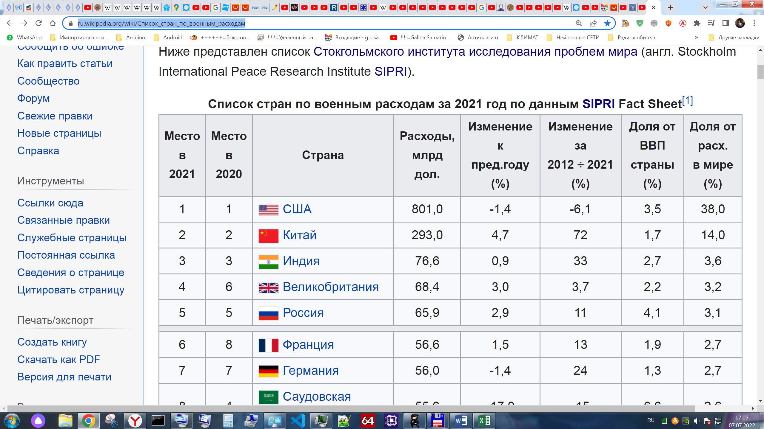 Для определения масштабов военных преступлений в государствах-членах ООН и перевода руководителей государств из категории жуликов в категорию военных преступников будем использовать исследования Стокгольмского института исследования проблем мира (SIPRI) Данные исследования этим институтом проводятся с 1969 года, а начиная с 1995 года в этих непрофессиональных преступных исследованиях участвует академия наук России в лице Института мировой экономики и международных отношений Российской академии наук им.Е.М.Примакова (ИМЭМО РАН). Напомним, что в этом «замечательном» институте работают 8 академиков, 8 член корреспондентов, 80 докторов наук и 212 кандидатов. Т.е. в наличии можно наблюдать организованную преступную группу, которая давно уже превратилась в военных преступников и шпионов, разрушающих с 1956г. сначала советскую, а затем «российскую» государственность. ИМЭМО РАН совместно с SIPRI уничтожают суверенитет всех стран-членов ООН. Т.е. эти институты не просто военные преступники, это институты, нарушающие международное право и устав ООН, т.е. они являются международными преступниками, тем самым нарушая конституции всех членов стран ООН. Во-вторых, эти институты, разрушают/уничтожают международное право, автоматически нарушают целостность, суверенитеты и независимость государств-членов ООН, т.е. являются государственными преступниками, так как они уничтожают конституции государств-членов ООН. И, в-третьих, в виде вишенки на торте, они являются военными преступниками, так как искажают реальную картину и рейтинги стран по военным расходам.