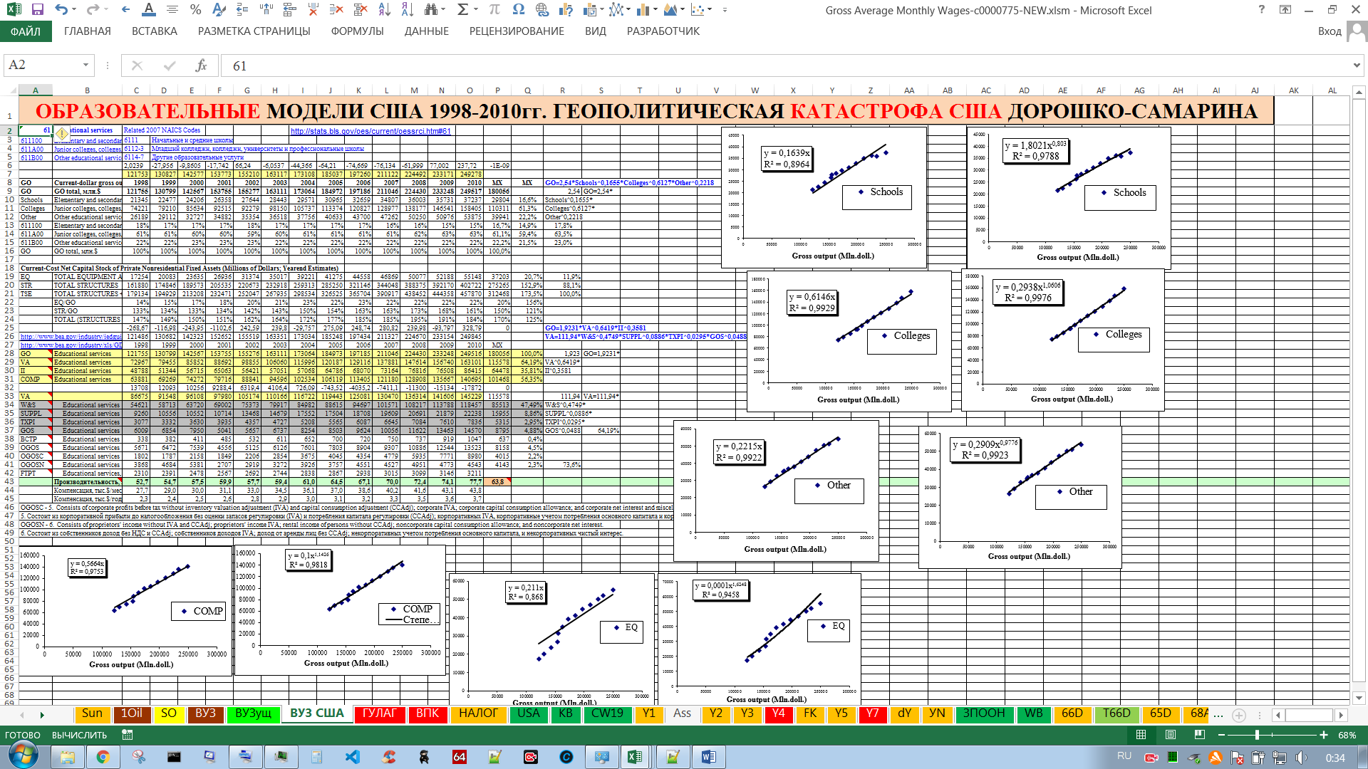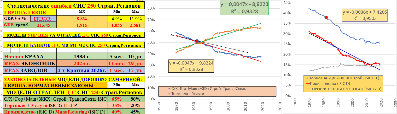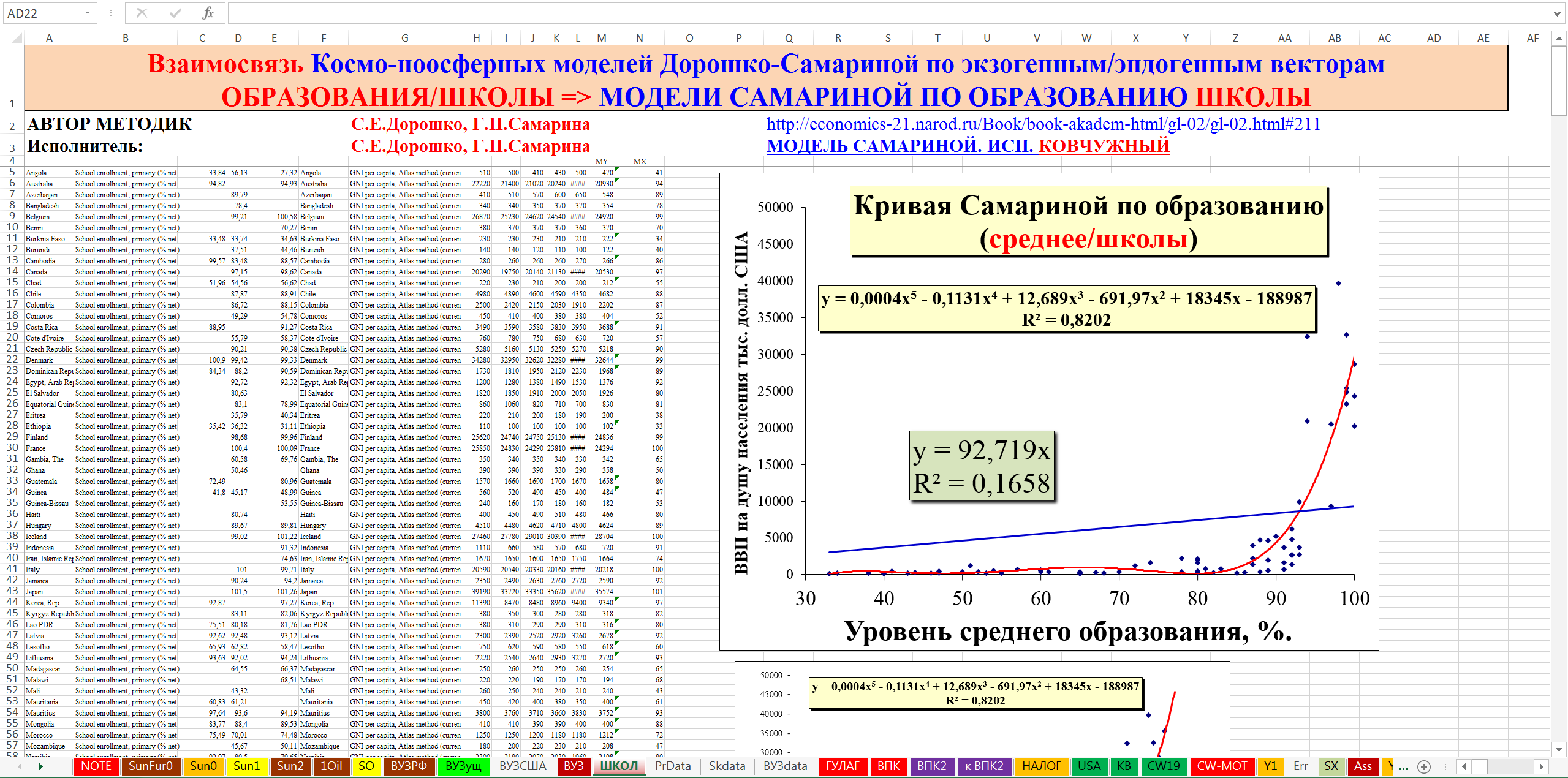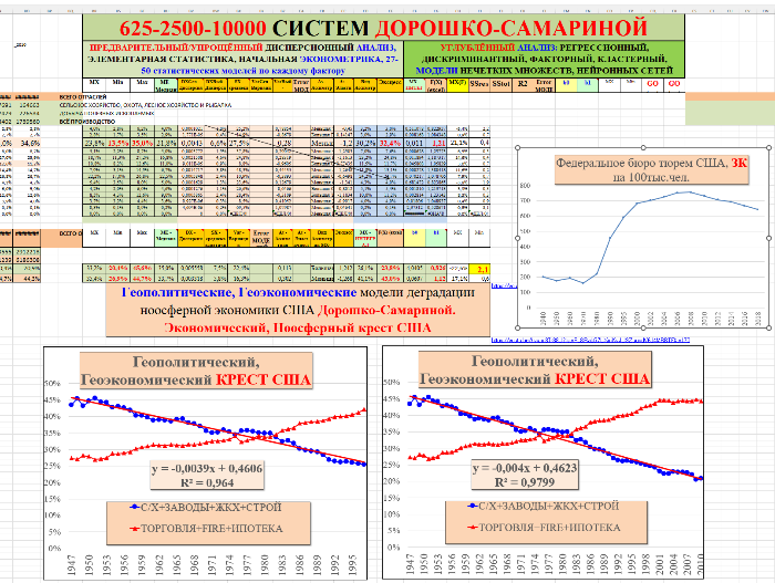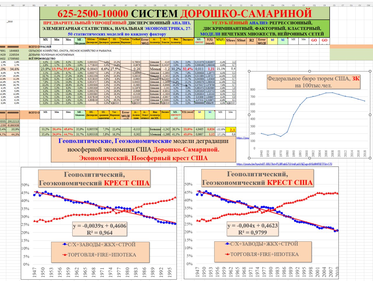 По уточнённым моделям авторов за период 1950-2020гг. в рамках космо-ноосферных систем Дорошко-Самариной можно утверждать, что в США к 1954 г. было уничтожено элитное классическое образование, а также образование для американского народа. Из моделей авторов видно, что из-за деградации образования в США с 6 сентября 1954 г. началось убийство экономики, промышленности и остатков образования. Авторы отдельно подчёркивают, что этот процесс осуществляется по заранее подготовленному плану с высокой последовательностью, что подтверждается показателем коэффициента детерминации R2=0.94. Этот процесс уничтожения или краха экономики США по моделям авторов был закончен в 01/06/2011 г. Промышленность США была уничтожена/сокращена в 4 раза к 29/05/2018 г. Этот плановый процесс ликвидации государственности США осуществлялся последовательно, что подтверждает коэффициент детерминации R2=0.98.