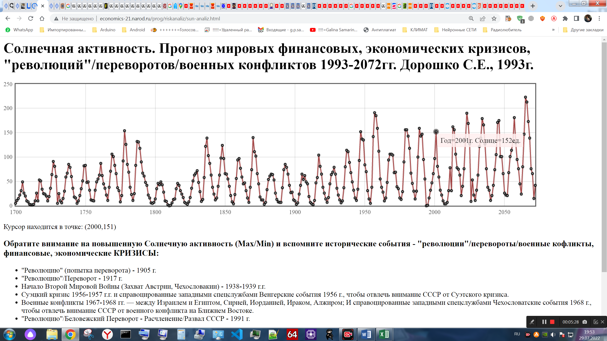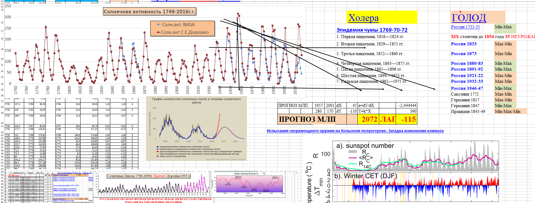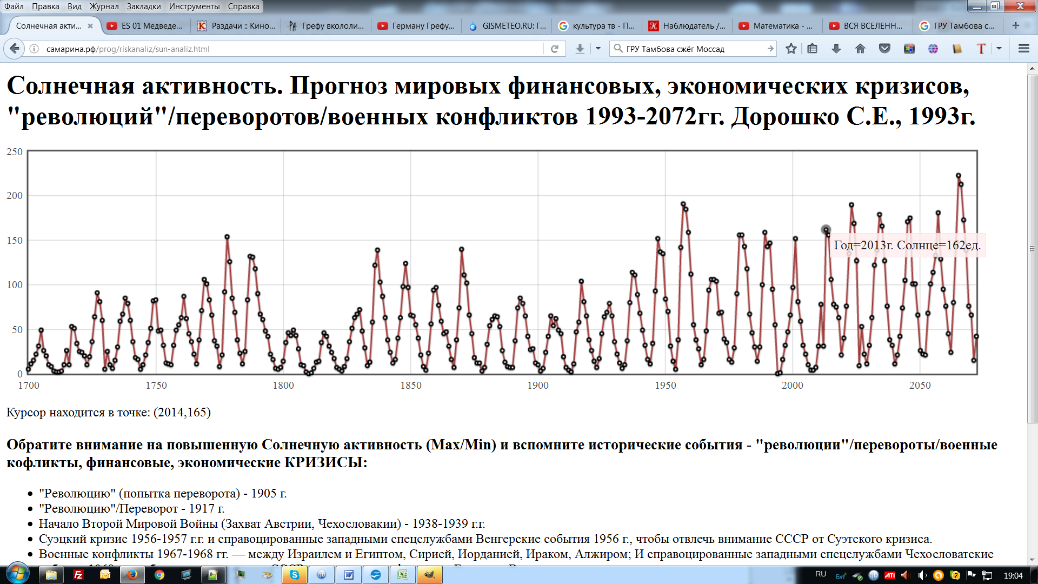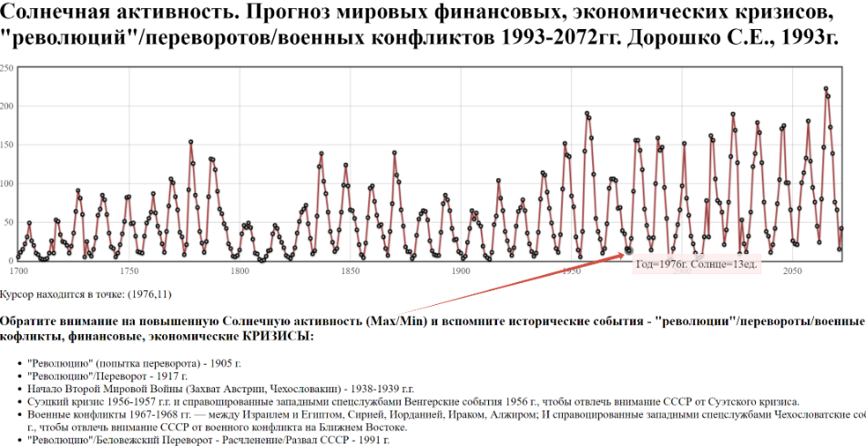 Напомним, что неурожаи во всём мире наблюдались: на спаде солнечной активности в 1921-1922гг. ближе к минимуму, связанные с засухой, а также при спаде солнечной активности 1932-1933гг. ближе к минимуму. Следует вспомнить о климатических причинах начала «Великой французской революции» 1789г. в период фазы подъёма солнечной активности 1786г. и максимума 1787-1788гг. и фазы спада солнечной активности 1789-1794гг. Напомним, что «…В 1787 году наблюдался недород шёлковых коконов (максимум солнца 1787г.). Это повлекло за собой сокращение лионского шёлкоткацкого производства. В конце 1788 года только в Лионе насчитывалось 20—25 тыс. безработных (максимум солнца 1788г.). От сильного града в июле 1788 года пострадал урожай зерновых во многих провинциях. Крайне суровая зима 1788/89 годов погубила многие виноградники и часть урожая. Цены на продовольствие поднялись…» (http://economics-21.narod.ru/prog/riskanaliz/sun-analiz.html).