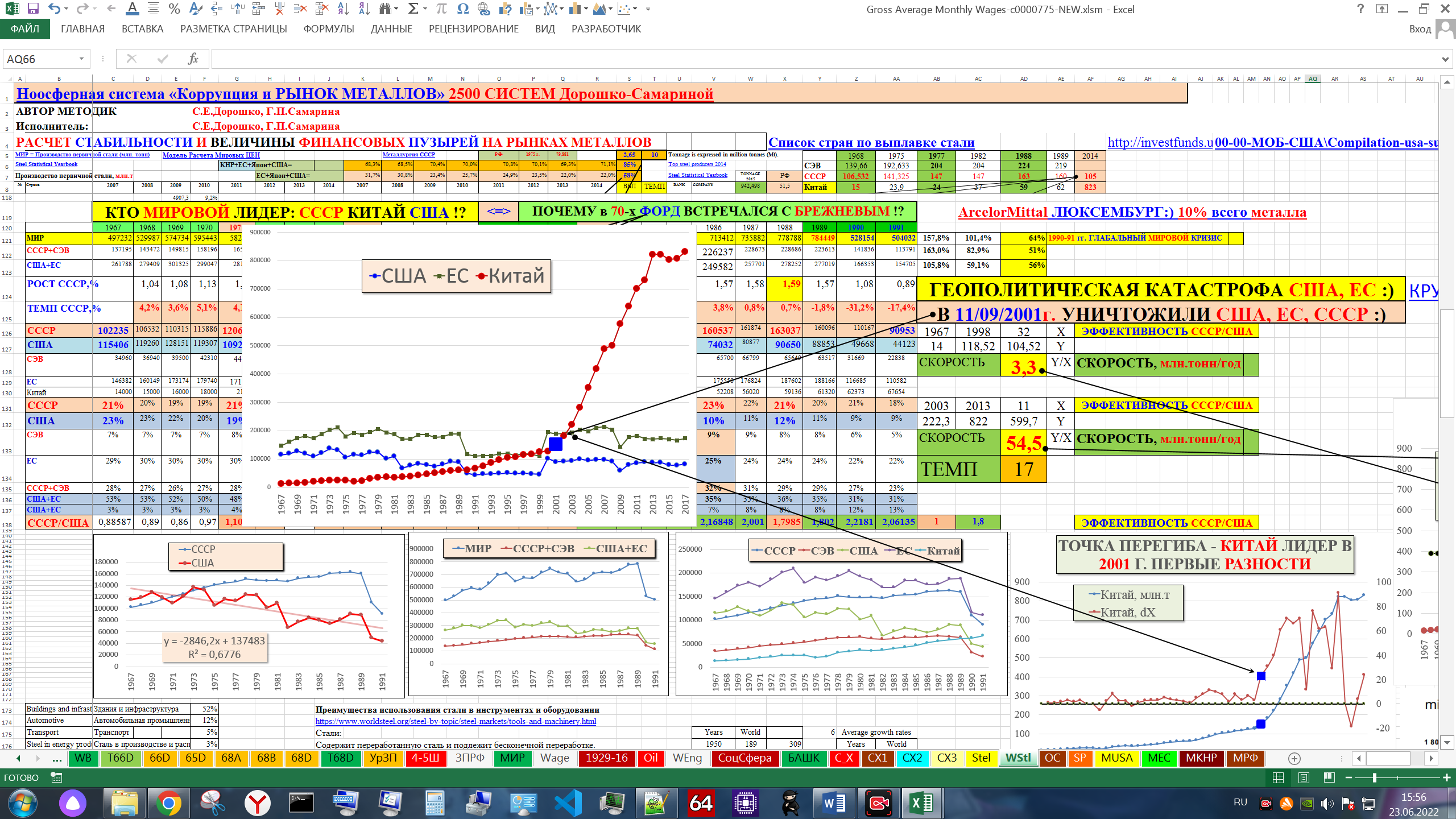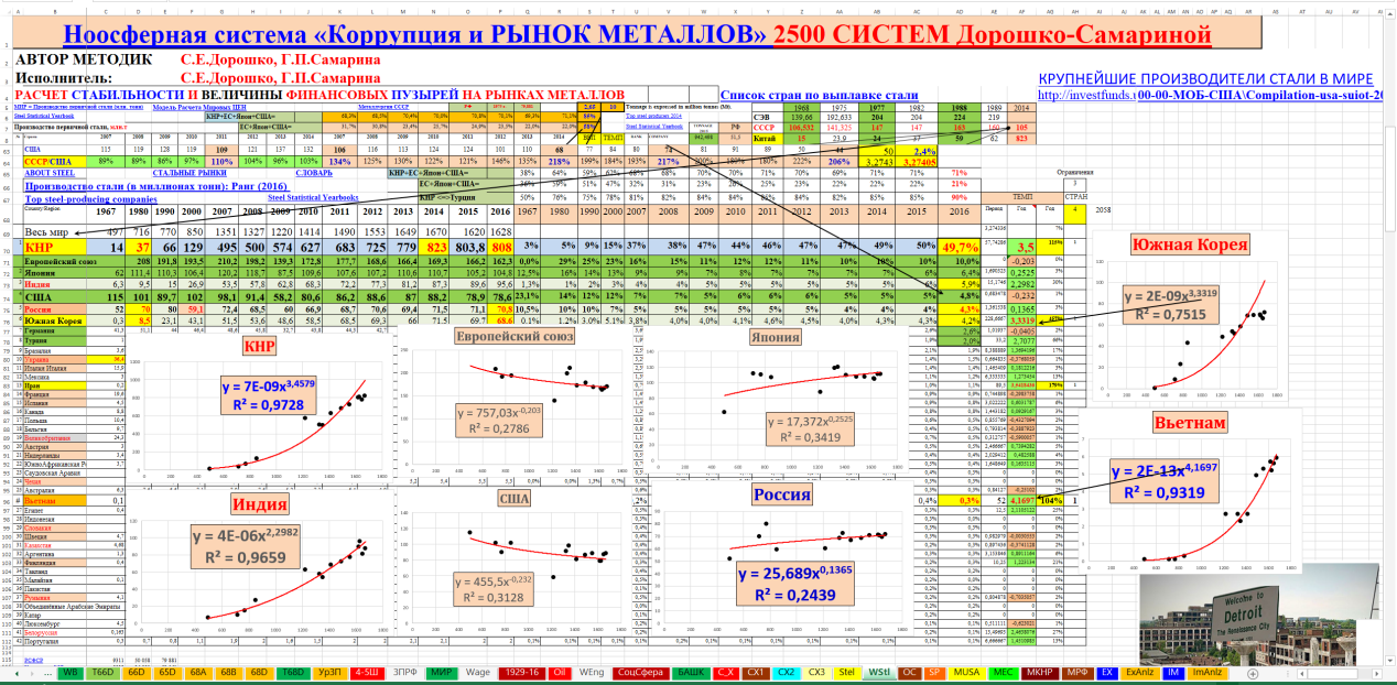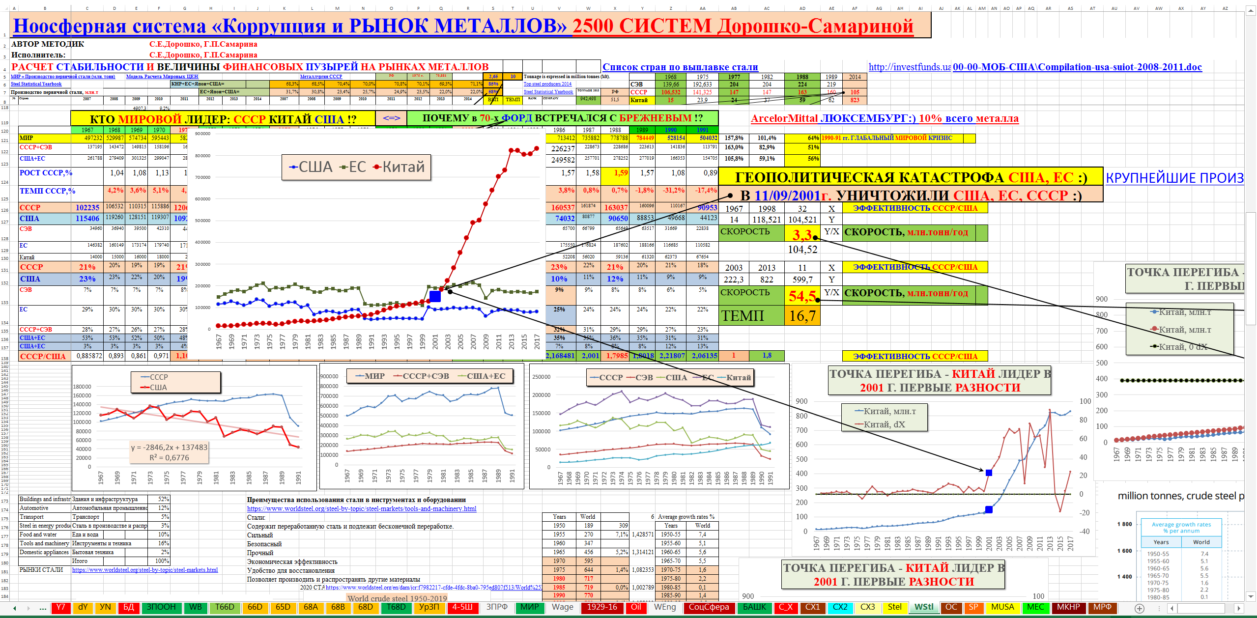 Космо-ноосферные исследования Дорошко-Самариной показывали точность геоэкономических и геополитических моделей временных трендов (корреляция R2=98%), демонстрирующих целенаправленное уничтожение США, как государства, так и мирового «лидера». Космо-ноосферные модели Дорошко-Самариной ещё в 1996-1998гг. показали, что ликвидация США началась с 1954 г.
