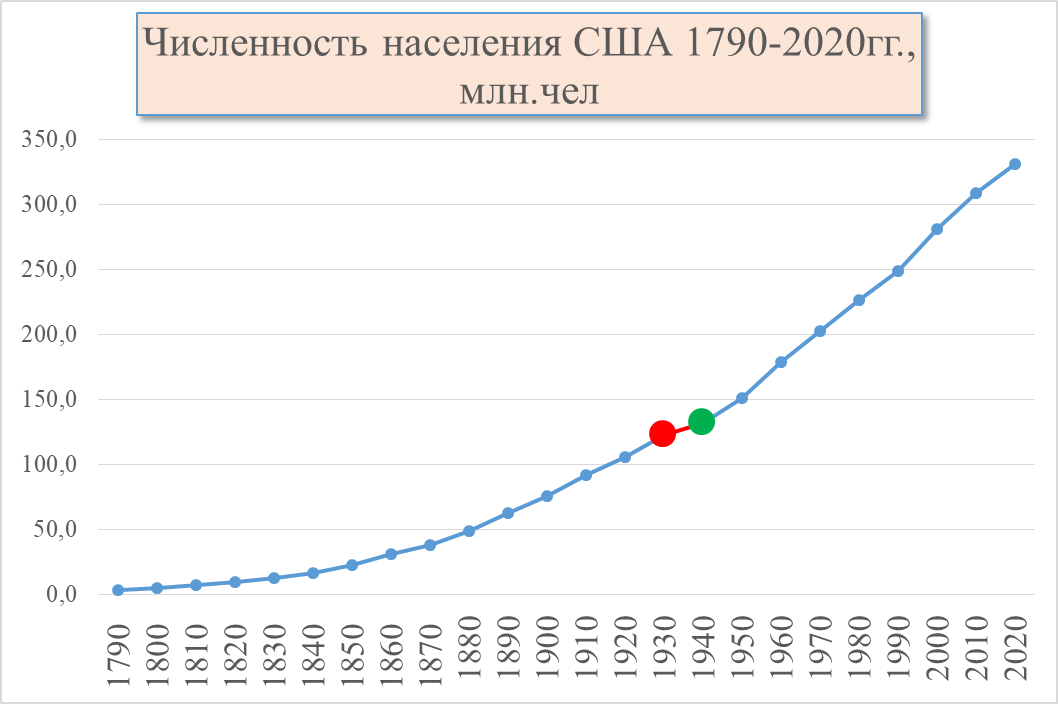 Графический образ динамики показателя численности населения США за период 1790-2020гг. Крупными точками выделен период 1930-1940гг. голодомора в США и период «Великой Депрессии».