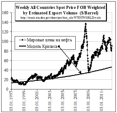 Но не это нас интересует. Нас интересует масштабность и скорость падения на мировом энергетическом рынке нефти, которое, возможно, поразит любого выпускника конвейера дураков экономических «элитных» ВУЗов США и мира. Начало фазы мирового финансового кризиса, как видно из графика, составляли 140 долларов США за баррель, а через 6 месяцев, уже в январе 2009 года, составила 45,88 долларов США, что отражено на графике.
