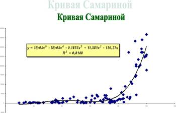 Анализ динамики WDI показал, что страны, которые достигли наиболее высоких темпов устойчивого развития, во-первых, обеспечили стабильный рост внешней мотивации, во-вторых, с определенной критической точки у них резко возрастает роль внутренней мотивации. Т.о. было выдвинута гипотеза, что кривая Самариной по образованию является частным случаем мотивационной кривой, а значит, согласуется с мотивационной теорией. При этом внешняя мотивация перестает выполнять доминирующую роль в развитии экономики предприятия, отрасли, региона, страны и переходит в фазу поддержки экономических тенденций. Начинает преобладать внутренняя мотивация с высокой степенью эластичности. Построить мотивационную кривую без создания специального ПО не возможно. Поэтому практические результаты нашим коллективом были получены только после разработки специального ПО, которое способно решать не только линейные, и квазилинейные, но главное нелинейные многофакторные уравнения. Мотивационная кривая Самариной изначально не линейна, описывается всеми классическими видами функциональных зависимостей, а также сплайн функциями различных степеней.