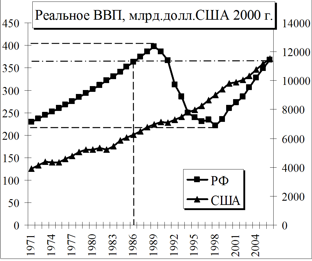 Учитывая статистические неточности официальных источников в разных временных периодах, все данные, расчеты были обработаны с помощью эконометрического программного обеспечения "Инвест" фонда "Ноосфера", разработанного авторами. Проблема статистической неопределенности является достаточно сложной и до сих пор неразрешенной проблемой [14,27-37]. Например, по данным работ В.Леонтьева по программе ООН в 1970 г. РФ по показателю ВВП на душу населения отставала от США в 2,79 раза. По более поздним исследованиям ООН в 1995-2005 г.г. разрыв составил 10,73 раза [14,29], т.е. в отчетах за разный временной период наблюдается четырехкратное (3,85 раз) смещение, ошибка [14,37]. Такие существенные расхождения лишний раз демонстрируют проблемы, которые могут возникать в процессе бенчмаркинга или эталонного тестирования, если оно проводится неправильно, т.е. опирается на некорректно сформированный экономический базис. Авторы согласны с расчетами и выводами комиссии В.Леонтьева, но не результатами расчетов и выводами Мирового банка, ООН последних лет, проводимые другой группой экономистов. Они не смогли понять и как следование рассчитать косвенно-латентные нелинейные связи реальной, а не виртуальной экономики. В результате была искажена база для расчета паритета покупательной способности, в том числе некорректно рассчитана инфляция, потребительская корзина и т.д. Данное утверждение авторами будет доказано в следующих главах.
