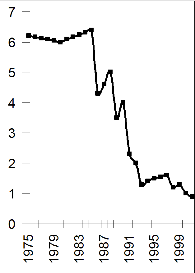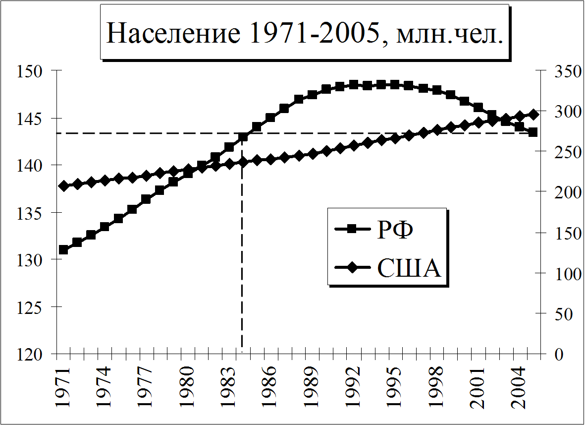 Как видно из рис. 1.1., 1.2., за исследованный период в экономике США наблюдается устойчивый рост, как показателя ВВП, так и численности населения. В России с момента начала реформ до 1998 года наблюдалось двукратное падение ВВП до уровня ниже 1971 года.