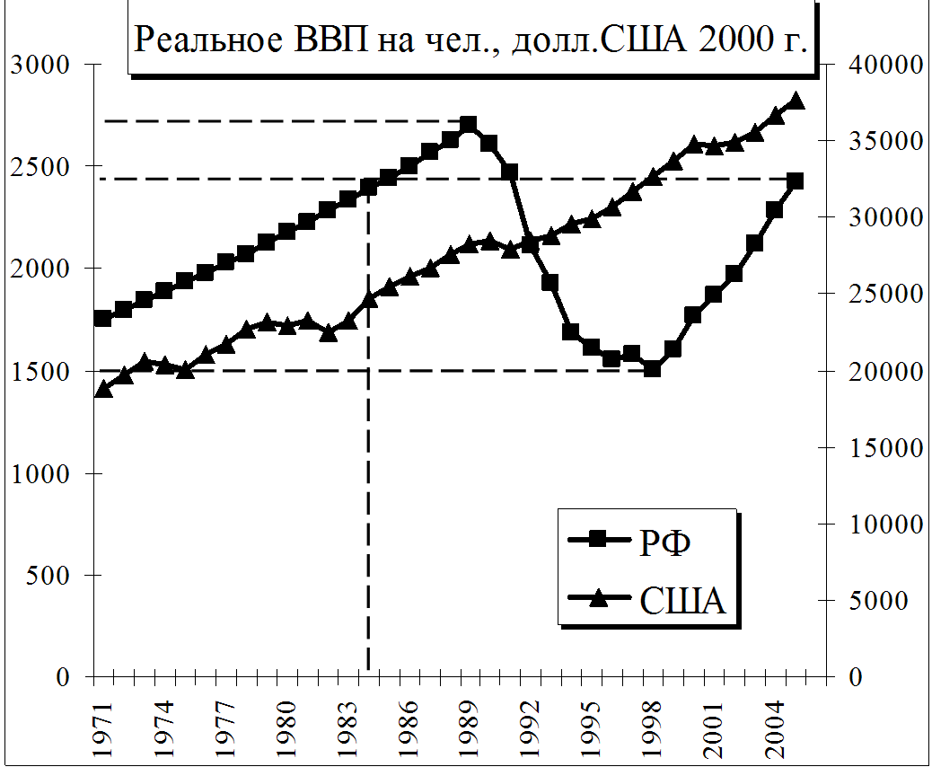 Начиная с 1999 г. по 2005 г. в РФ наблюдался устойчивый рост до уровня 1986 г. на фоне падения численности населения до уровня 1984 года. Понятно, что данные зависимости рис. 1.1., 1.2. необходимо откорректировать с учетом численности населения. Для этого рассчитаем реальное ВВП и доход на душу населения за исследованный период. Полученные результаты представлены на рис. 1.2., 1.3. Как видно из рис. 1.2., 1.3., за исследованный период в экономике США наблюдается устойчивый рост, как ВВП, так и численности населения. Российские данные пришлось откорректировать - показатели реального ВВП на душу населения, реальный доход на душу населения за исследованный период. Откорректированные данные показали дальнейшее снижение. В результате следует отметить, что по этим более корректным показателям российская экономика находится на уровне дореформенной России не 1986 г., а 1984 г. При условии признания программы ООН от 1979 г. по данным В. Леонтьева Россия отстает от уровня 1970 г. в 2,78 раза.