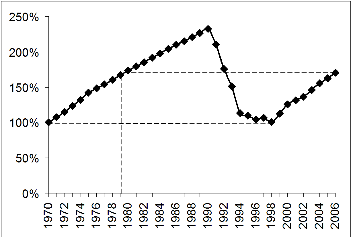 По мнению ведущих экспертов правительства РФ, Мирового банка, такая высокая динамика роста российской экономики, начиная с 1998 г., в основном связана со значительным ростом мировых цен на сырьевых рынках. Так, в частности, цены на нефть с 1998 г. по 2006 г. выросли с 9-11 долл. США за баррель до 60-70 долл. США за баррель [14,27-37]. Вторым позитивным фактором развития российской экономики, по мнению экспертов, послужил отказ от политики построения финансовой пирамиды на базе государственных казначейских обязательств и прочих государственных заимствований. Третьим позитивным фактором, по мнению экспертов, является начало формирования в общественном сознании после дефолта 1998 г. внятной экономической политики [14,27-37]. Поэтому для доказательства вышеприведенных подходов о возможных смещениях в эталонном тестировании проанализируем состояние промышленности России по данным Росстата РФ. В этих целях рассмотрим состояние и динамику развития промышленности за период с 1970 по 2006 годы на основе анализа интегрированного показателя объема производства промышленной продукции в РСФСР и РФ (в сопоставимых ценах, 1970 = 100%), который представлен на рис. 1.4.
