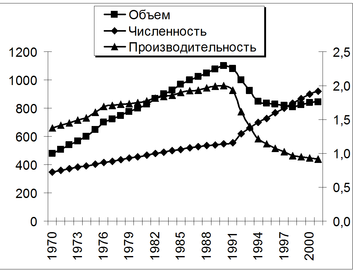 Устойчивое развитие наблюдалось в период до 1990 года, когда был достигнут экстремум показателя. При этом вызывает настороженность необоснованно высокая динамика показателя среднегодовой численности промышленно-производственного персонала, который, начиная с 1992 года, устойчиво растет, несмотря на значительный спад производства электроэнергии. В результате неэффективного управления в период реформ показатель средней производительности труда упал по сравнению с 1990 г. с 2,2 млн.кВт-час/чел до 1 млн.кВт-час/чел в 2005 году. В итоге производительность труда на предприятиях отрасли снизилась в 2,2 раза.