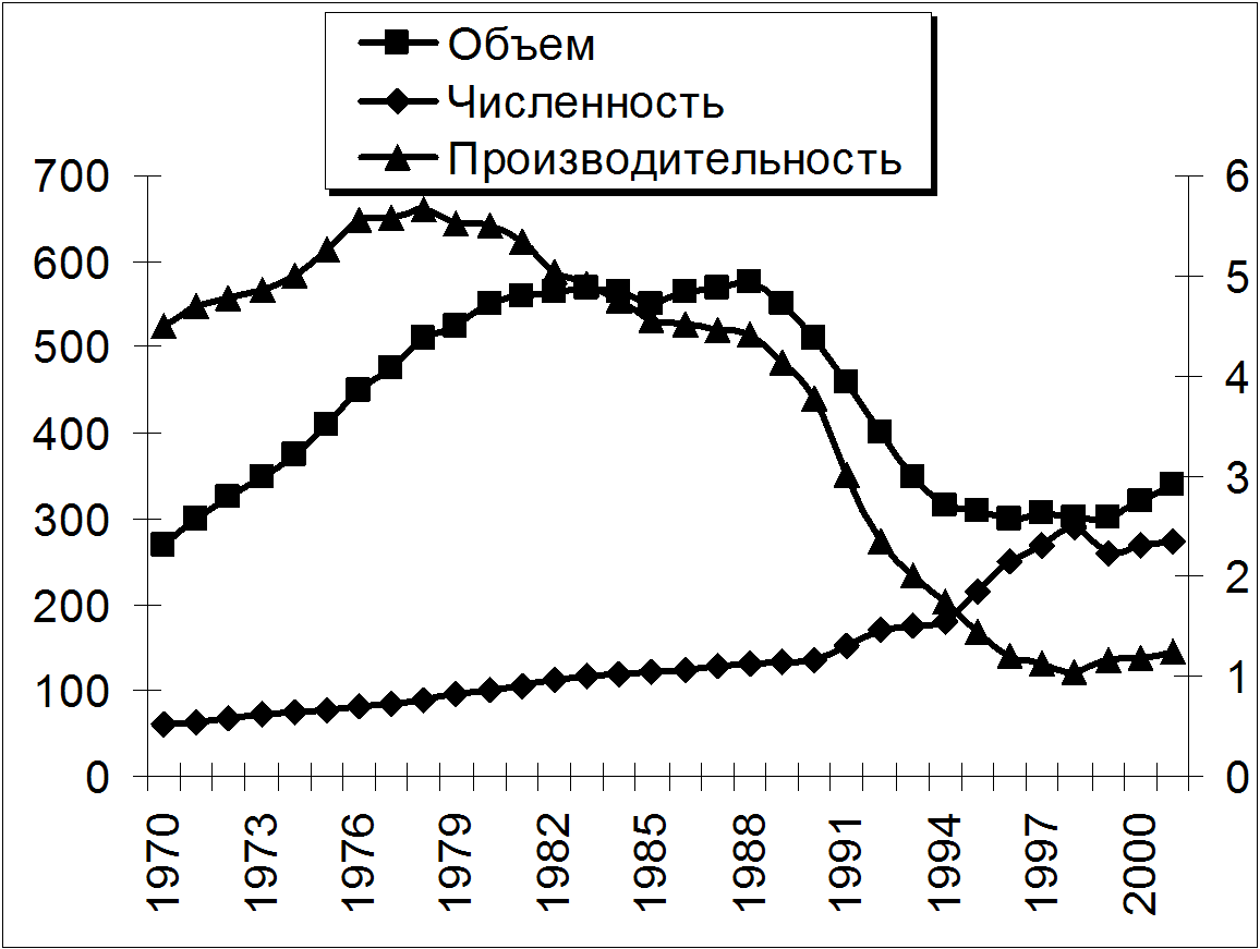 Приступим к анализу нефтегазового комплекса (НГК) России, как еще одной системообразующей отрасли. НГК формирует необоснованно высокие цены в стране, соответствующие мировым, как следствие инициирует инфляцию, повышенную себестоимость ЖКХ, строительного комплекса и других отраслей. Для подтверждения этого исследуем динамику развития нефтедобывающей промышленности за период с 1970 по 2005 годы). Проанализируем показатели объема добычи нефти, млн. т. (левая шкала рис. 1.7.), число занятых в отрасли, тыс. чел. (левая шкала рис. 1.7.) и производительность труда в отрасли (правая шкала рис. 1.7.).