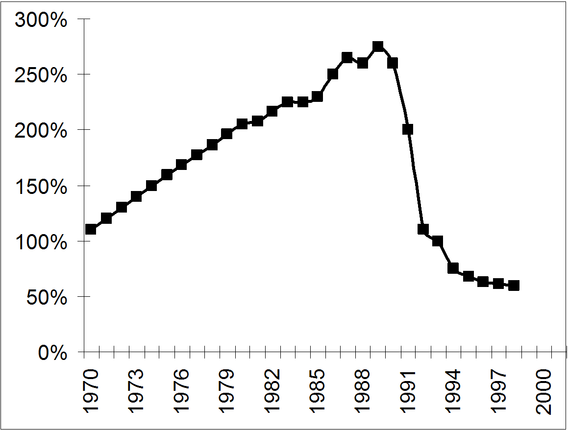 Рис. 1.8. Ввод в действие основных фондов в строительстве в РСФСР и РФ, в % к 1969 г., в сопоставимых ценах. http://www.gks.ru/