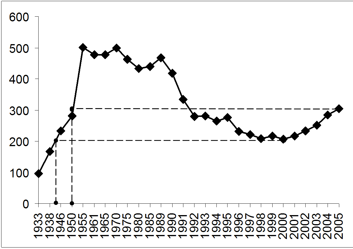 Очевидно, что столь печальное состояния исследованных показателей неизбежно должно отразиться на динамике жилищного строительства. Для этого проведем анализ показателя ввода в действие жилья в РСФСР и РФ (кв. м на 1000 человек населения). За 2004 г. ввод в действие жилья в РФ составило всего 284.3 м2 на 1000 человек населения и наконец достигло уровня 1950-1951 г.г., что убедительно доказывает рис. 1.9. [14,27-37]. Заметим, что в 2002 г. строительство находилось на послевоенном уровне 1946 г., а в 1998 г. на довоенном уровне.