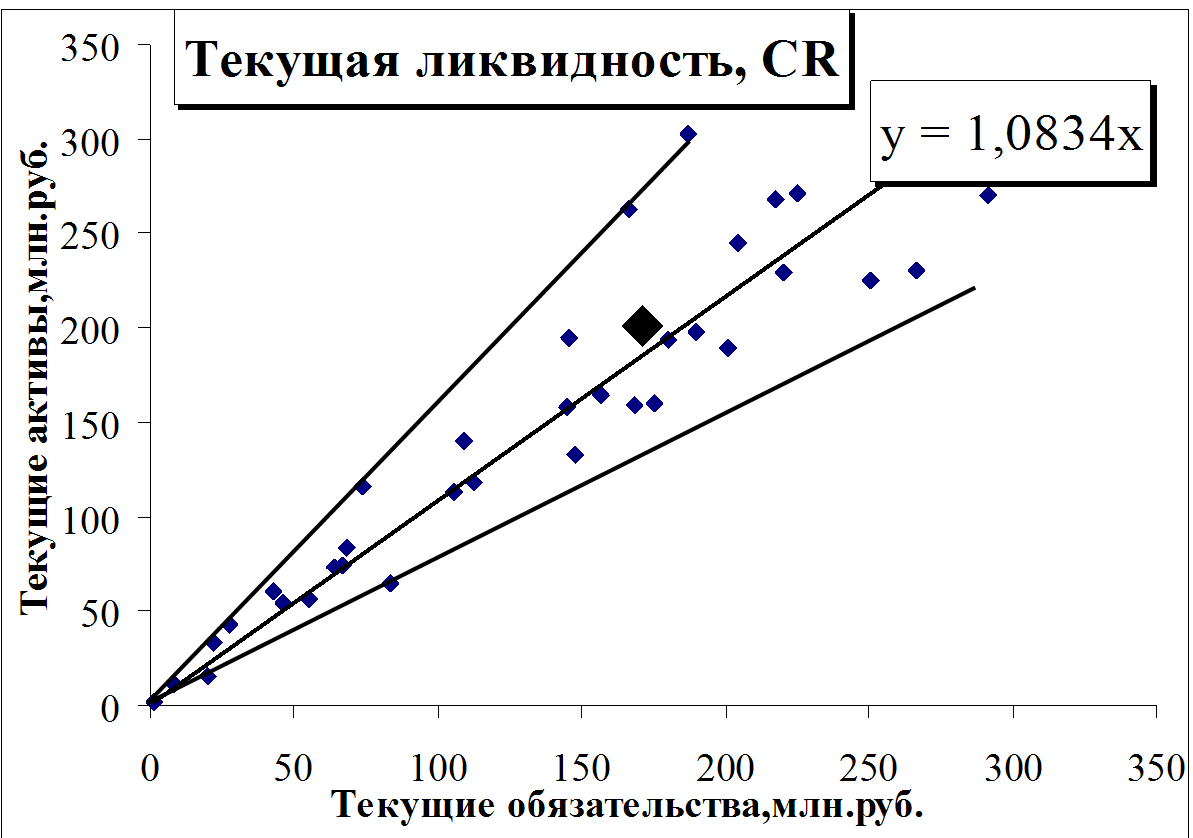 Как видно из рис. 1.10., среднеотраслевой показатель коэффициента текущей ликвидности равен 1,0834. При этом проведены еще две линии. Нижняя линия отражает функциональную зависимость коэффициента текущей ликвидности в среднем худших предприятий отрасли, значение коэффициента равно 0,7772.
