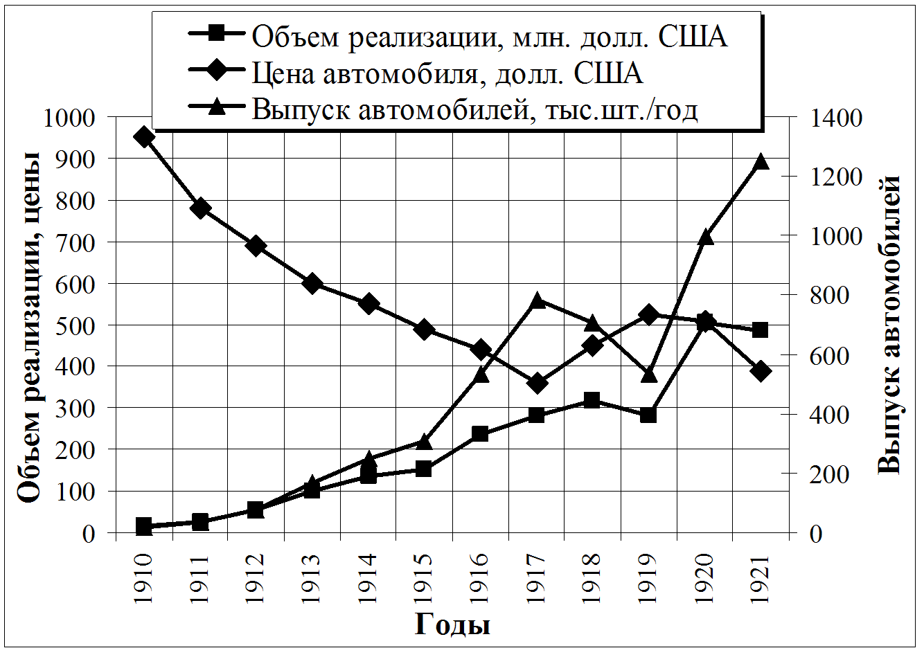 Рис. 2.1. Динамика объемов реализации, цен и выпуска автомобилей компанией Г.Форда