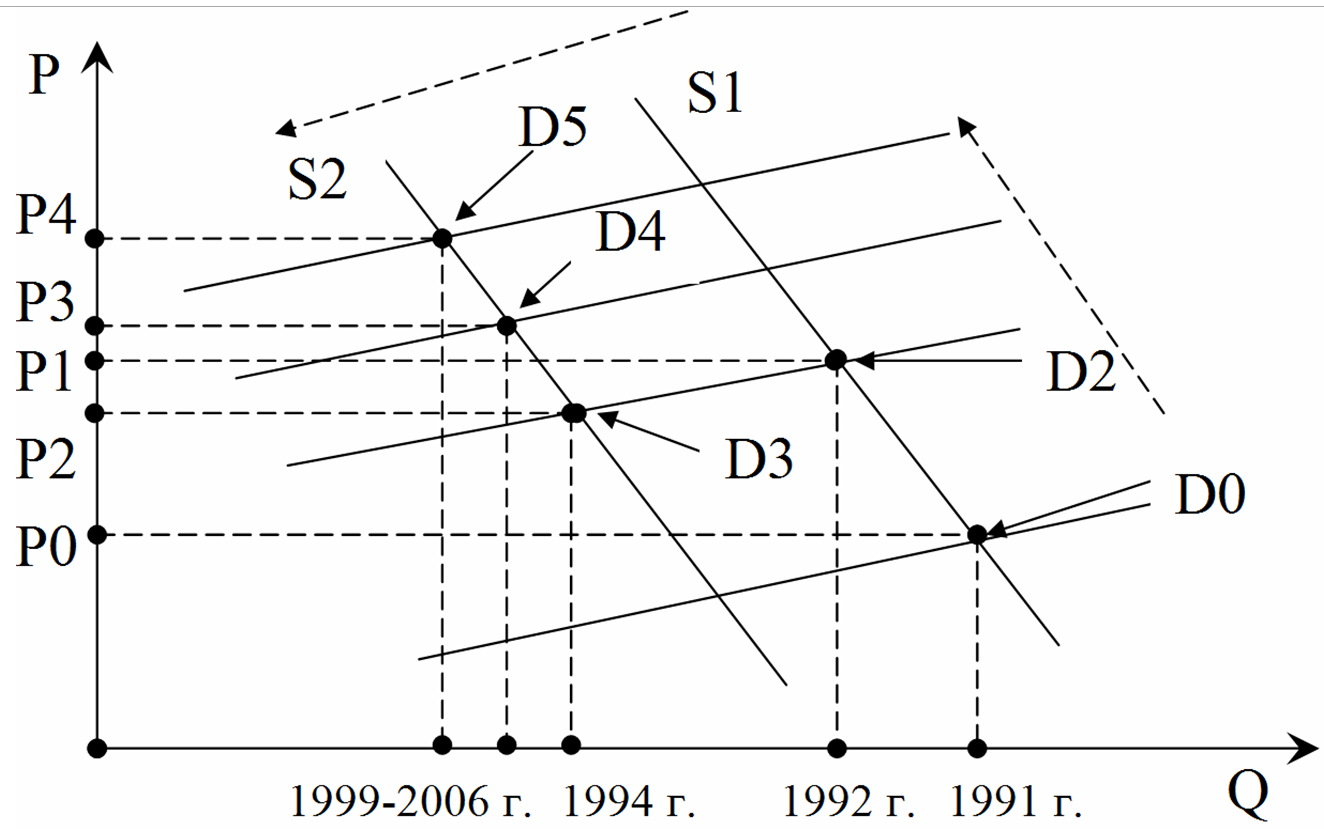 Для ускорения приватизации власть начала проводить денежно-кредитную эмиссию, которая, по мнению экономистов-либералов, позволяла быстро перейти из социализма в капитализм. Эта эмиссия еще более ускоряла инфляцию, и как следствие снижала реальную заработную плату и сжимала внутренний рынок и ВВП. Этот процесс представлен на рис. 2.3. в виде дальнейшего роста кривой предложения из-за роста инфляции с точки Р2 до точки Р3. В результате ВВП упало с уровня D3 до уровня D4.