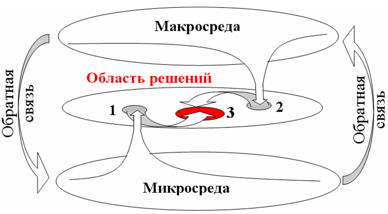 Авторы считают, что цель управления и моделирования заключается в том, чтобы с помощью обратных связей, показанных на рисунке 2.22., осуществить стягивание, корректировку начальных, граничных условий, что, в свою очередь, вызывает эконометрическое изменение модели в целом. Зоны 1 и 2 будут стягиваться в зону 3, в которой учитываются требования микросреды фирмы по оптимальному управлению персоналом и обеспечению его соответствующими технологиями и капиталом с учетом запросов макро, мезо среды фирмы. В тоже время, учитывая, что модели макро, мезо среды отражают средние тенденции в отрасли, а фирма может по своим показателям превосходить эти данные, то в этом случае модели макро, мезо среды корректируется в пользу моделей микросреды. Т.к. на самом деле оптимальная зона находится не в точке 3 или 2, а в точке 1, при условии, что фирма по всем показателям превосходит среднеотраслевые данные. Если же фирма явно отстает от средних показателей своих конкурентов, то можно с уверенностью сказать, что зона оптимума находится не в точке 1 и 3, а в точке 2, и всем подразделениям фирмы следует пересмотреть свои плановые показатели и оценку своей деятельности. Если же фирма по ряду показателей лучше среднеотраслевых, а по ряду хуже, то в этом случае производится подгонка и макро, и микро моделей. Тогда зона 1 и зона 2 должны быть стянуты в зону 3. Данный процесс итерационен и каждое из изменений по любому количеству факторов (в наших исследованиях около 5000 показателей по каждой отрасли) может осуществляться автоматически с помощью модифицированного метода Монте-Карло [5,10,11,33-37,44,100].