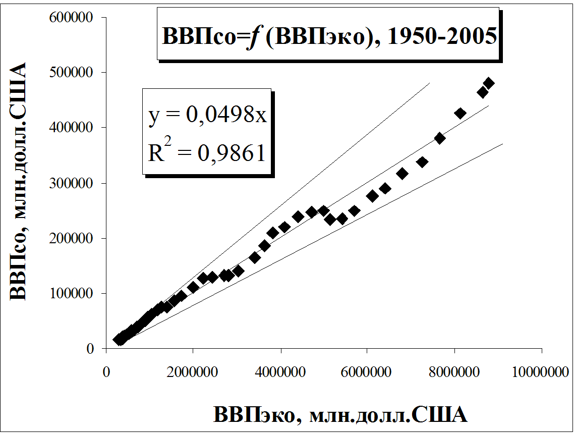 Рис. 3.3. Зависимость показателя ВВП строительной отрасли (ВВПсо) от ВВП экономики США (ВВПсо) за период 1950-2005 г.г., млн.долл.США