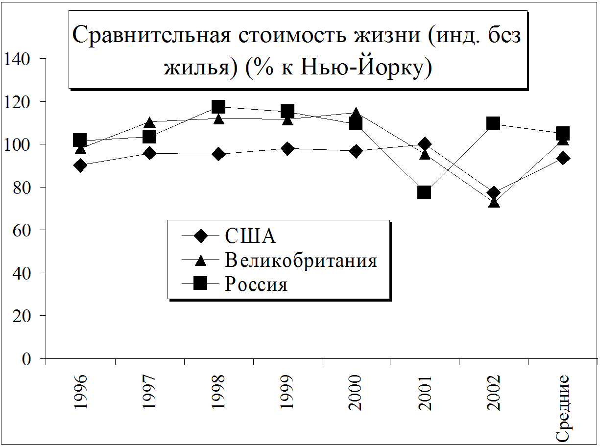Рис. 3.4. Сравнительная стоимость жизни (без жилья), % к Нью-Йорку [ http://www.cemi.rssi.ru/]