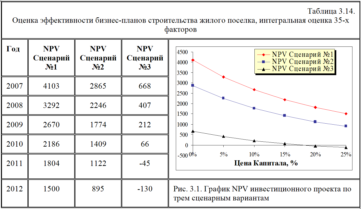 Приступим к расчету основных показателей оценки эффективности бизнес-планов завода-автомата по строительству жилых поселков по трем сценариям с учетом возможного изменения процентной ставки на финансовых рынках России. Т.е. необходимо определить, насколько чувствителен инвестиционный проект к изменению данного параметра. Учитывая, что наиболее точно оценку инвестиционного проекта осуществляет NPV критерий, поэтому анализ начнем с него. При этом под сценарием №1 будем понимать лучший вариант развития событий, сценарий №2 - средний вариант и сценарий №3 – худший вариант.