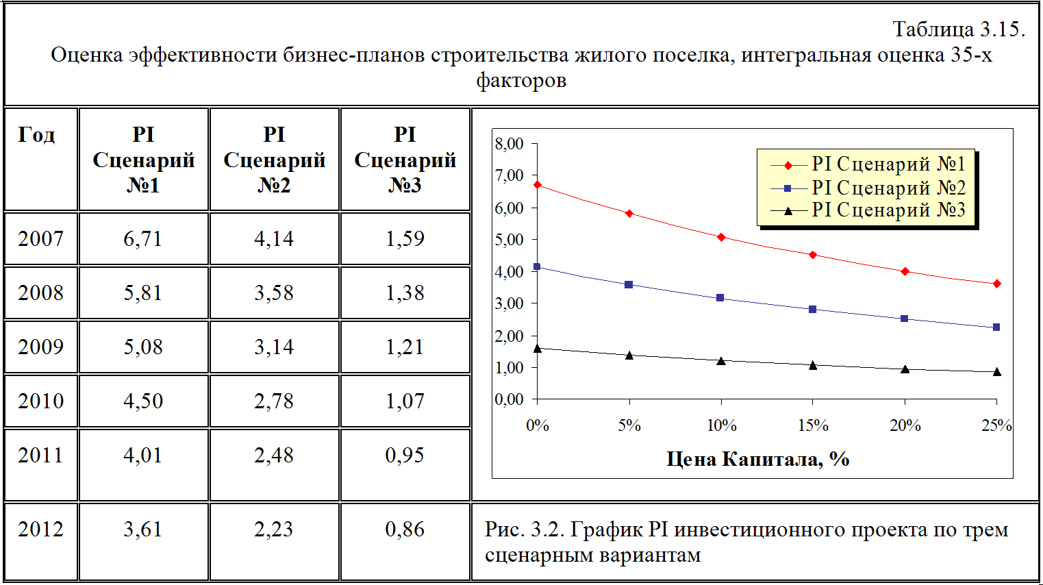 Рассмотрим насколько этот предварительный вывод об устойчивости инвестиционного проекта всех трех сценариев подтвердит другой критерий оценки PI – индекс рентабельности, или доход на единицу затрат, как его иногда называют. При этом аналогично предыдущему анализу под сценарием №1 будем понимать лучший вариант развития событий, сценарий №2 - средний вариант и сценарий №3 – худший вариант. Расчет основных параметров представлен в таблице 3.15.