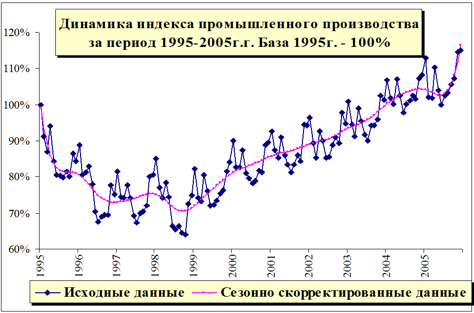 Рис. 2.5. Месячная динамика индекса промышленного производства за период 1995-2005г.г. Базовый 1995г. принят за 100%. Данные сезонно откорректированы