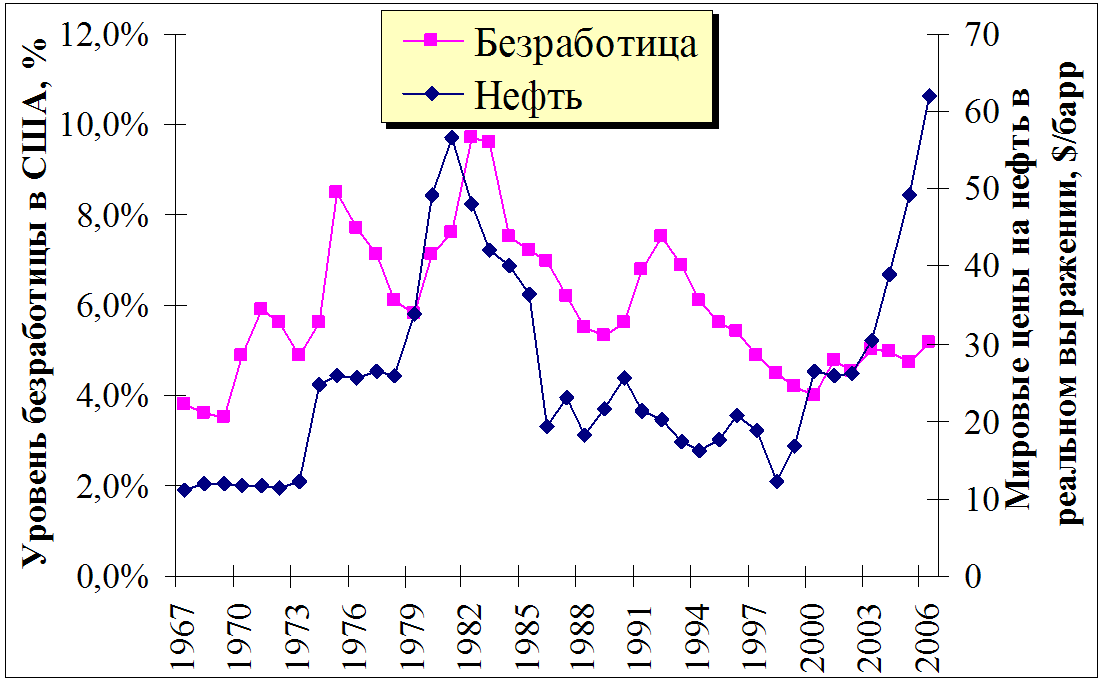 Рис. 2.1. Динамика безработицы в США и мировых цен на нефть в реальном выражении, долл.США/барр за период 1967-2006 г.г.