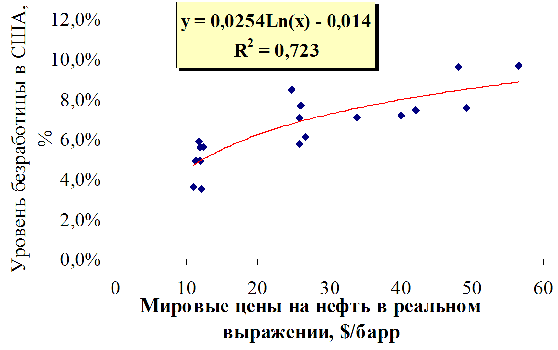 Рис. 2.2. Модель зависимости безработицы в США от мировых цен на нефть в реальном выражении, долл.США/барр за период 1967-2003 г.г.