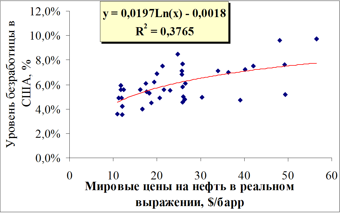Рис. 2.3. Модель зависимости безработицы в США от мировых цен на нефть в реальном выражении, долл.США/барр за период 1967-2006 г.г.