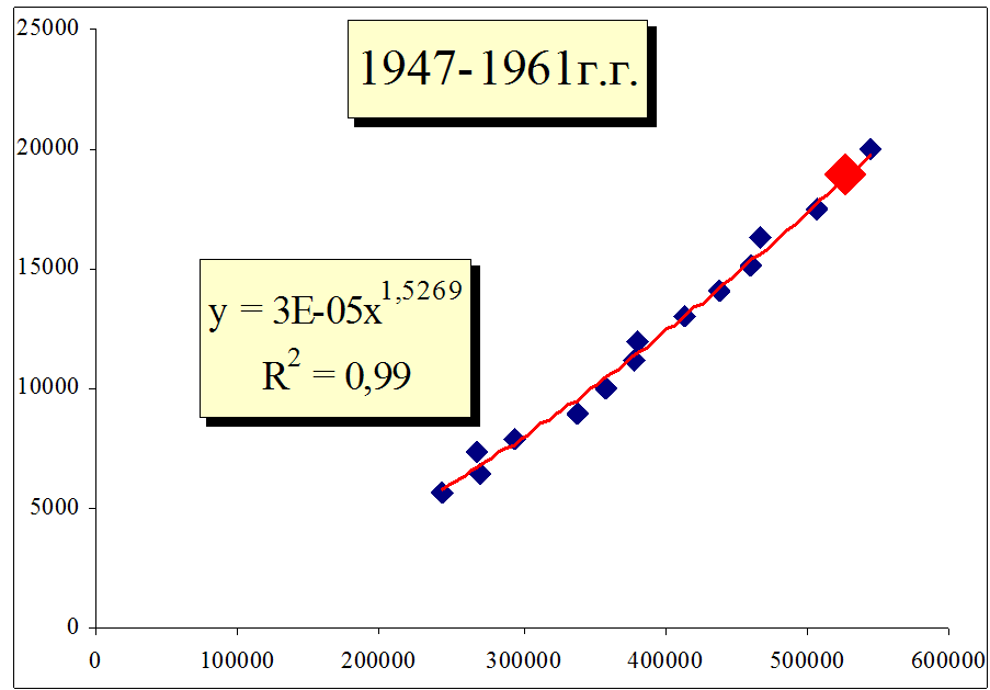 Отметим, что в исследованный период в США прошло четыре кризиса 1948-1949, 1953-1954, 1957-1958, 1960-1961 г.г. В тоже время влияние четырех кризисов на развитие финансовой системы, как показывает график, не очень заметно. Это как-то не увязывается с выявленной ранее вариацией, синергетических бифуркаций в процессе динамического анализа денежной массы и ВВП страны. Выявленное только на первый взгляд - противоречие.