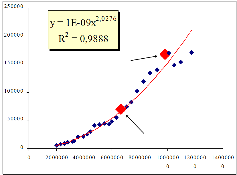 При таком темпе изменения исследуемый показатель достиг величины в 471%. Значение показателя вариации составило – 47,8%. Отметим, что в исследованный период в США прошло четыре кризиса. Это и отразилось на показателе эластичности, который равен 203%, что значительно меньше показателя темпа роста 471%. В данный период процесс развития фондовой системы, несмотря на высокий темп, не отличался достаточной стабильностью. Ранее говорилось, что такой разброс показателей эластичности и темпа роста может свидетельствовать о наличии синергетических бифуркаций. Поэтому на данном этапе исследования намеренно дан графический образ для подтверждения или опровержения данного факта. Как видно из графика, четко наблюдаются две выделенные точки бифуркации. Первая точка бифуркации (отмечена стрелкой) в период 1995-1996 г.г., когда произошел финансовый кризис на азиатских рынках.
