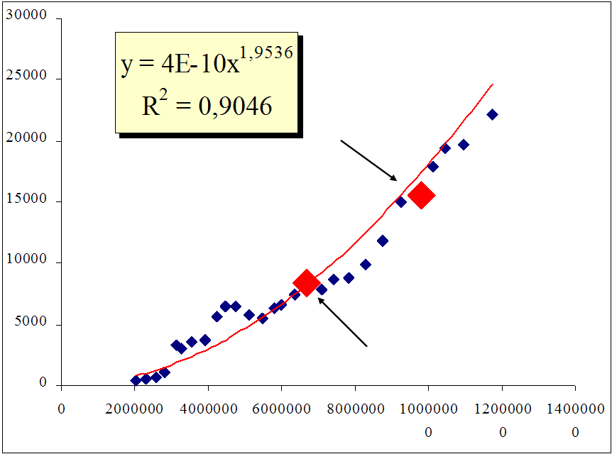 Понятно, что при таком темпе изменения исследуемый показатель достиг значительной величины в 937%. Значение показателя вариации составило – 39%. Отметим, что в исследованный период в США прошло 4 кризиса. Это и отразилось на показателе эластичности, который равен 195%, что не значительно меньше показателя темпа роста 937%. Это характеризует тот факт, что в данный период процесс развития трастовой системы, несмотря на очень высокий темп, не отличался достаточной нестабильностью. Ранее отмечалось, что разброс показателей эластичности и темпа роста в сторону понижения и/или повышения может свидетельствовать о наличии синергетических бифуркаций. Поэтому на данном этапе исследования умышленно дан графический образ для подтверждения или опровержения данного факта. Как видно из графика, четко наблюдаются две выделенные точки бифуркации. Первая точка бифуркации (отмечена стрелкой) в период 1995-1996 г.г., когда произошел финансовый кризис на азиатских рынках. Трастовые компании, как правило, управляют зарубежными американскими активами, ценность которых в период кризиса на азиатских, японских, европейских финансовых рынках значительно упала, как следствие снизилась доля их трастовых услуг. Таким образом, была выявлена эта точка бифуркации.
