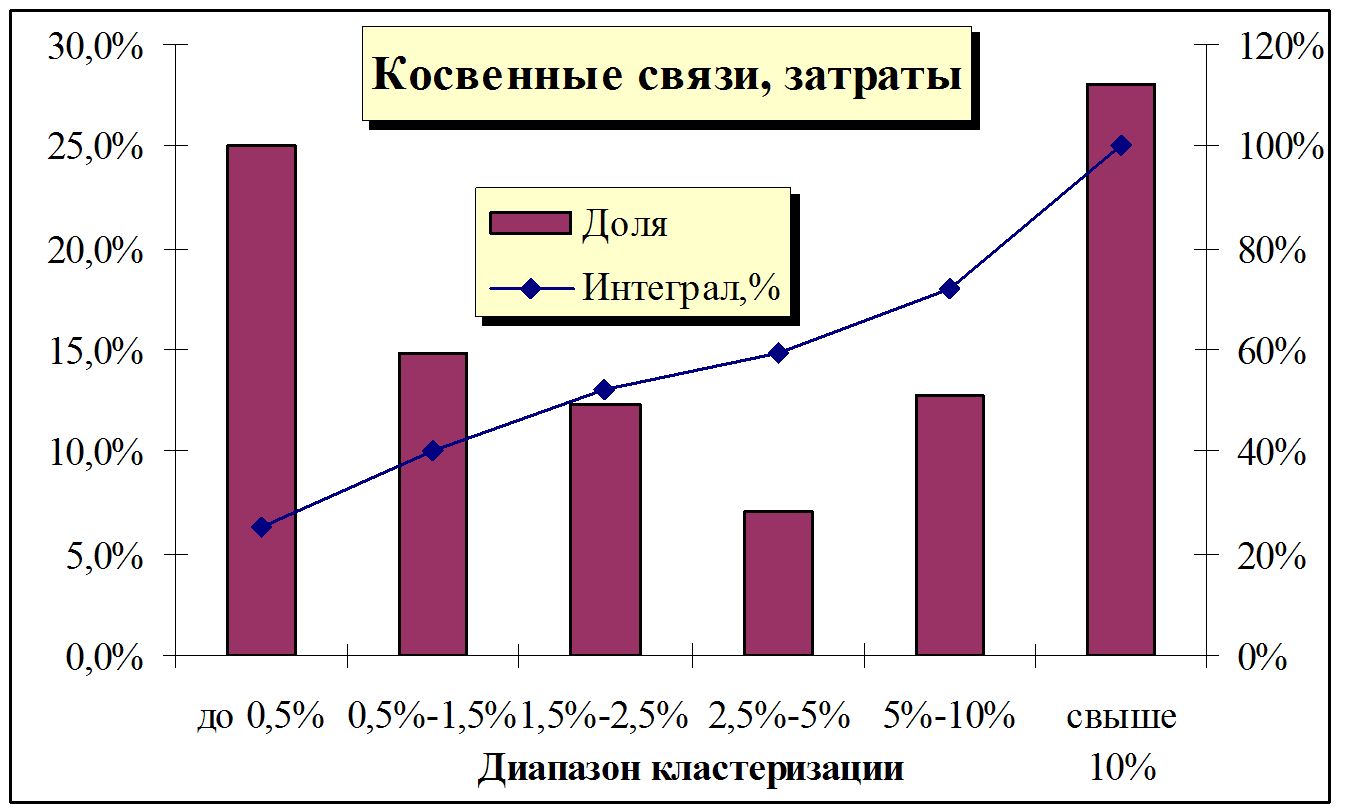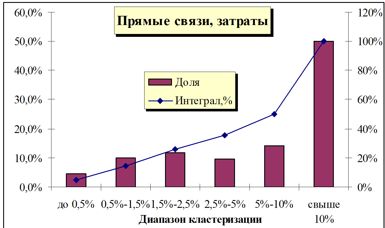 В кластерный карман с весом, лежащим в диапазоне 0-0,5%, попали предприятия более чем 45 агрегированных отраслей. При этом несмотря на их значительное количество доля прямых затрат составила всего 4,6%, при этом интегральный показатель распределения составил 4,6%. В тоже время доля косвенных затрат составила 25,0%, что более чем в 5 раз превышает прямые затраты, при этом интегральный показатель распределения - 25,0%, что сигнализирует о серьезных синергетических эффектах.