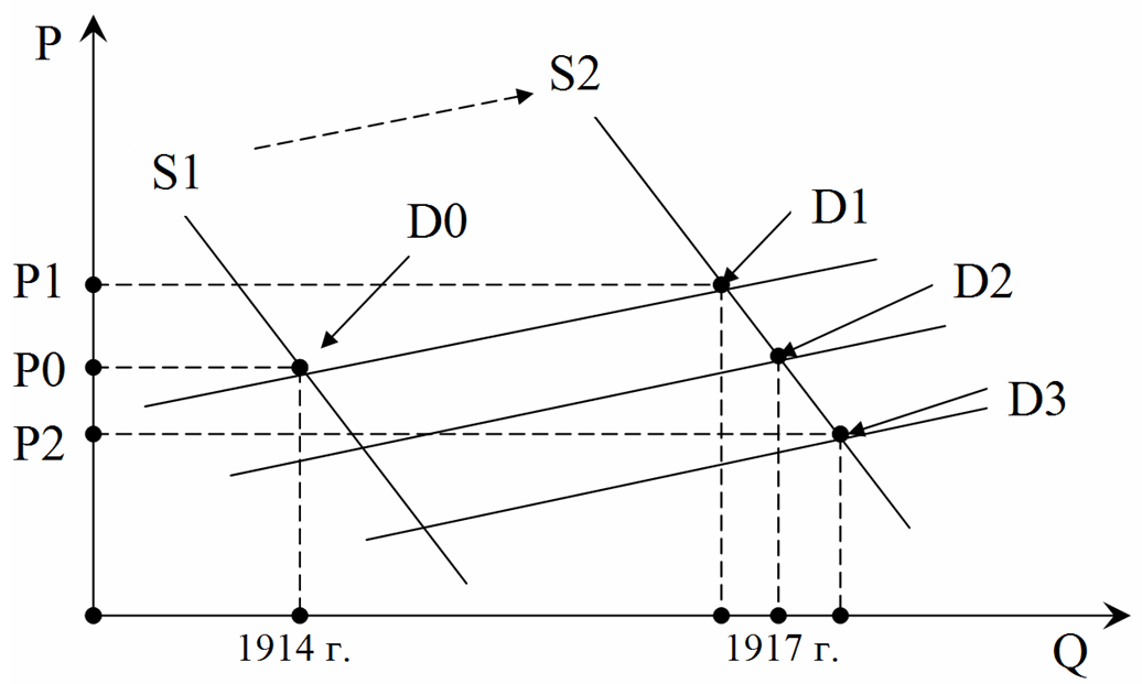 Для ускорения приватизации власть начала проводить денежно-кредитную эмиссию, которая, по мнению экономистов-либералов, позволяла быстро перейти из социализма в капитализм. Эта эмиссия еще более ускоряла инфляцию, и как следствие снижала реальную заработную плату и сжимала внутренний рынок и ВВП. Этот процесс представлен на рис. 1.9. в виде дальнейшего роста кривой предложения из-за роста инфляции с точки Р2 до точки Р3. В результате ВВП упало с уровня D3 до уровня D4.