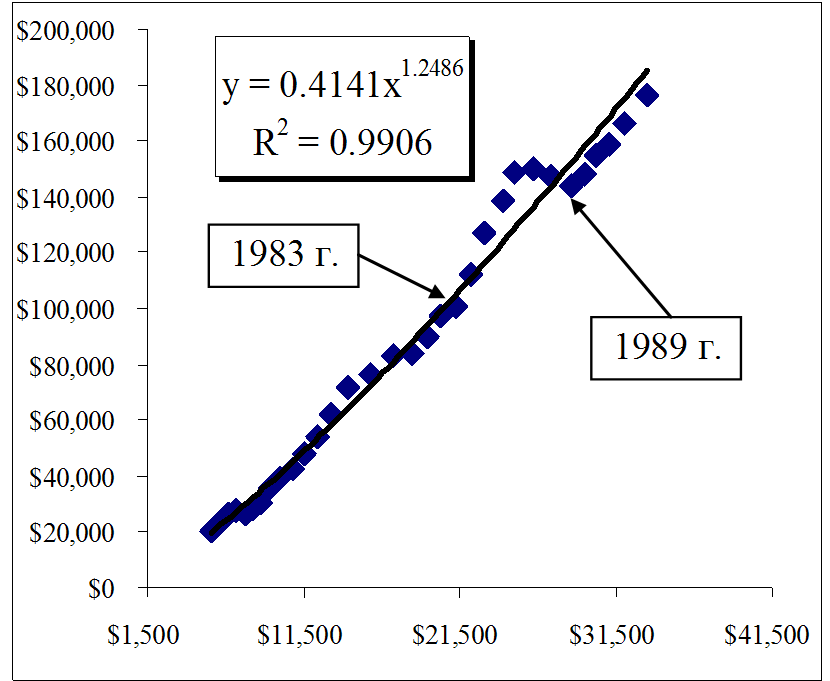 Выявим характерные черты бифуркаций времен Рейгана (1983-1989 г.г.) и сегодняшней ипотечной бифуркации (1999-2006 г.г.). Т.е. учитывается только пик, других данных на конец 2006 г. у авторов не было. Анализируя функциональные зависимости можно обнаружить еще одну характерную, но очень важную черту - в среднем цены на жилье опережали рост оплаты труда с темпом более 2 раз. Так, в период 1983-1989 г.г. цены на жилье опережали рост оплаты труда с темпом – 2,0328 (рис. 1.14.), в период 1999-2006 г.г. цены на жилье опережали рост оплаты труда с темпом – 2,0656 (рис. 1.15.).