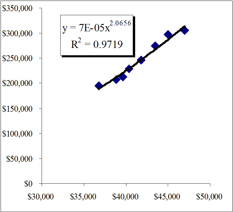Для того чтобы понять, как надувался ипотечный пузырь, авторы решили показать его в виде графика. В своих прогнозах конца 2006 г. начала 2007 г. авторы использовали показатель House Price Indexes (рис. 1.12.). Рассмотрим функциональную зависимость показателя средней стоимости дома от средней оплаты труда за период 1964 - 1997 г.г. Анализ показал, что в среднем цены на жилье опережали рост оплаты труда с темпом 1,2486 (рис. 1.13.).