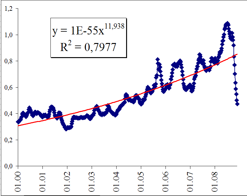 Когда в мире росли цены на нефть российские нефтяные магнаты говорили, что в РФ рыночная экономика, и поэтому цены на бензин в РФ естественно выше, чем в США. Также активно рассказывали олигархи других отраслей, почему на всех рынках РФ цены в 1,5 и более раз выше, чем в США. При этом они забывали, что заработная плата в РФ в 10 и более раз ниже, чем в США. Обратите внимание, при анализе функциональной зависимости розничных цен на бензин в США от мировых цен на нефть их динамика составляет в среднем 0,6269 как при росте рынка, так и при его падении (рис. 1.18.).