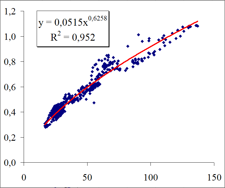 Рис. 1.18. Функциональная зависимость еженедельных розничных цен на бензин в США (ось Y –долл.США/литр) от мировых цен на нефть (ось Х –долл.США/баррель) за период 2000 - 2008 г.г. |