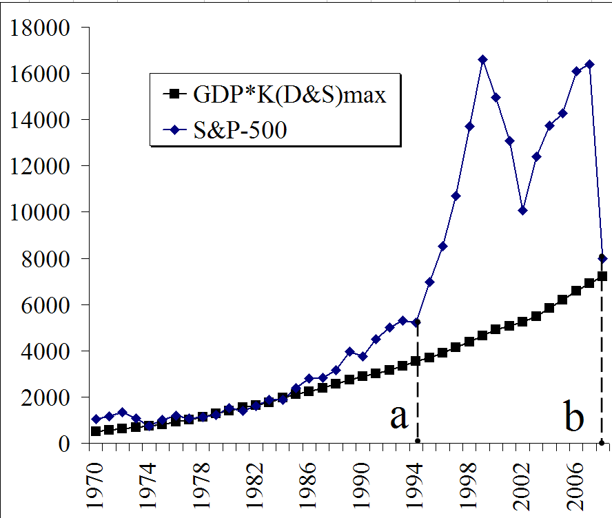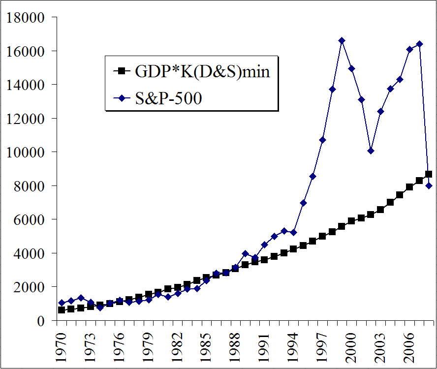 Анализ динамики рынка авторами проводился с начала введения индекса S&P. На втором рис. 1.20. дана интегральная оценка минимального финансового пузыря – это площадь, заключенная между кривыми GDP*KD&S и индекса S&P.