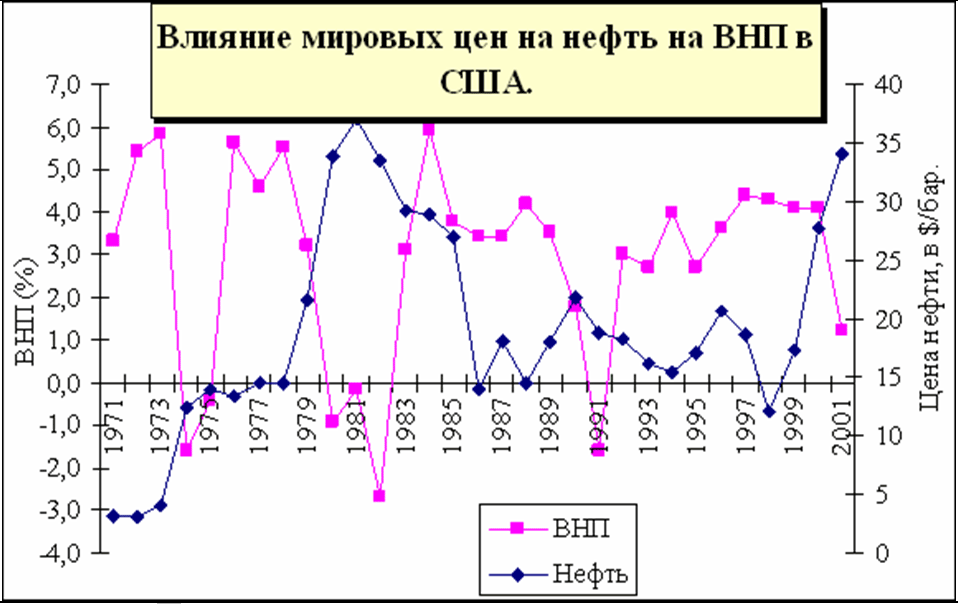 Рис. 3.1.3. Влияние мировых нефтяных цен на динамику реального ВНП (%) США. |