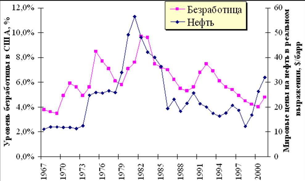 Для нашего исследования интересен тот факт, что рост мировых цен на энергоресурсы неизбежно отразится на снижении трудовой мотивации через рост безработицы, и как следствие рост бедности в стране. Для этого рассмотрим еще один график, отражающий показатели мировых цен на нефть в реальном выражении и уровень безработицы в США за период 1967-2001 г.г. Для наглядности данная зависимость отражена на рисунке 2.1.4.