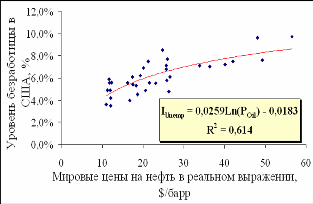 Как видно из графика, это влияние очевидно. Однако следует рассмотреть причину, отражающую эффект, присущий теории ожидания. Рост цен вызывает рост безработицы с временным фазовым сдвигом в 1 год, это подтверждается и статистически – корреляция без учета фазового сдвига составляет 66%, а с учетом – 80%. Т.е. фирмы начинают сокращение не сразу после роста цен, а с годовым опозданием. Они ожидают, что данный рост отображает случайные рыночные колебания, и только при условии продолжающегося устойчивого роста цен на энергоносители идут на вынужденное сокращение. Проведем регрессионный анализ с целью выявления экономической и статистически значимой функциональной зависимости. При построении данной зависимости будем учитывать выявленный ранее фазовый сдвиг, подтверждающий теорию ожидания, а также будут учтены реальные или номинальные мировые цены на нефть. В результате была получена следующая функциональная зависимость:
