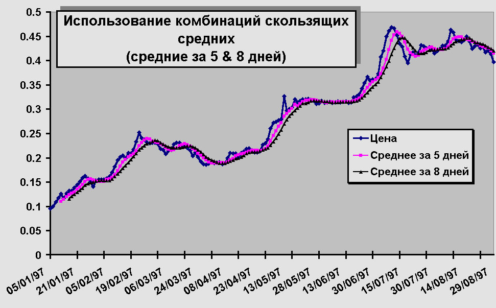 Рис.7. Использование комбинаций скользящих средних за 5 и 8 дней