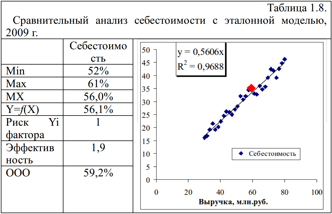 Приступим к анализу фактора себестоимость (X1→Y) и его зависимости от выручки (X) (см. табл. 1.8.). Он является результатом деятельности большинства структурных подразделений (он как бы является интегральным показателем деятельности большинства служб ООО).