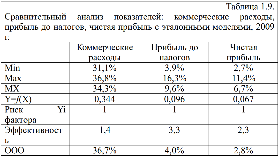 Сравнительный анализ показателей: коммерческие расходы, прибыль до налогов, чистая прибыль с эталонными моделями, 2009 г.