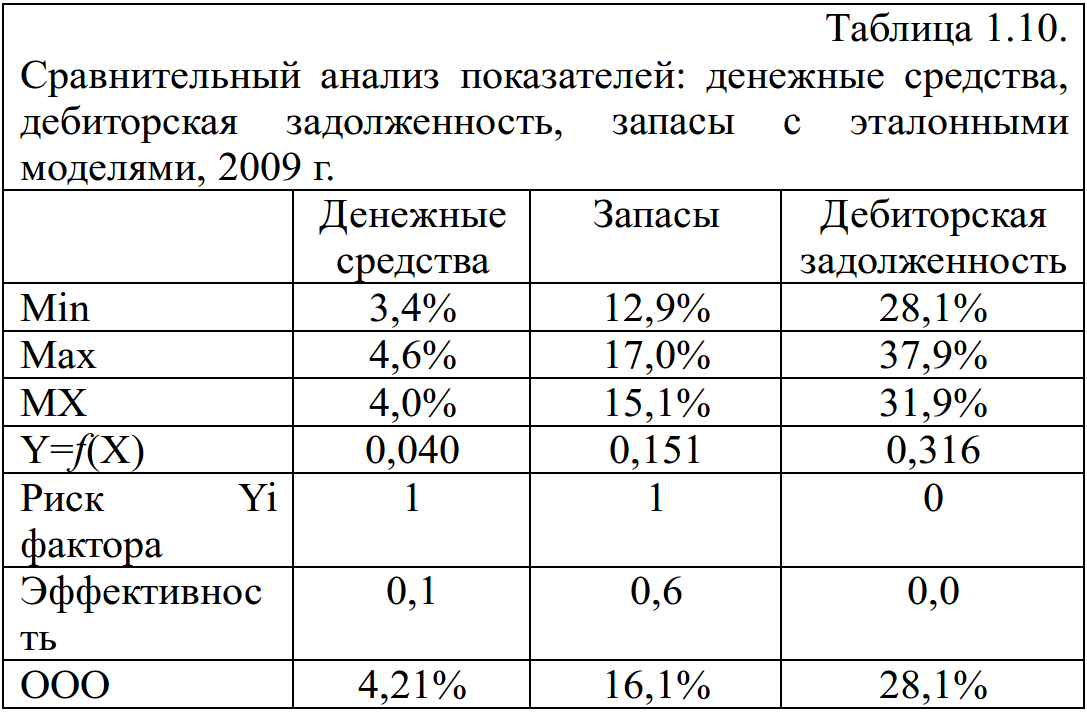 Сравнительный анализ показателей: денежные средства, дебиторская задолженность, запасы с эталонными моделями, 2009 г.