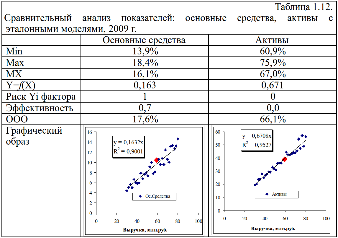 Проведем анализ фактора основные средства (X9→Y) и его зависимость от выручки (X) и интегрального (суммарного) показателя активы (X10→Y) от выручки (X). Уточним, что в фактор основные средства включены все внеоборотные активы. Для наглядности эконометрические зависимости от выручки представлены на графиках и сведены в табл. 1.12.